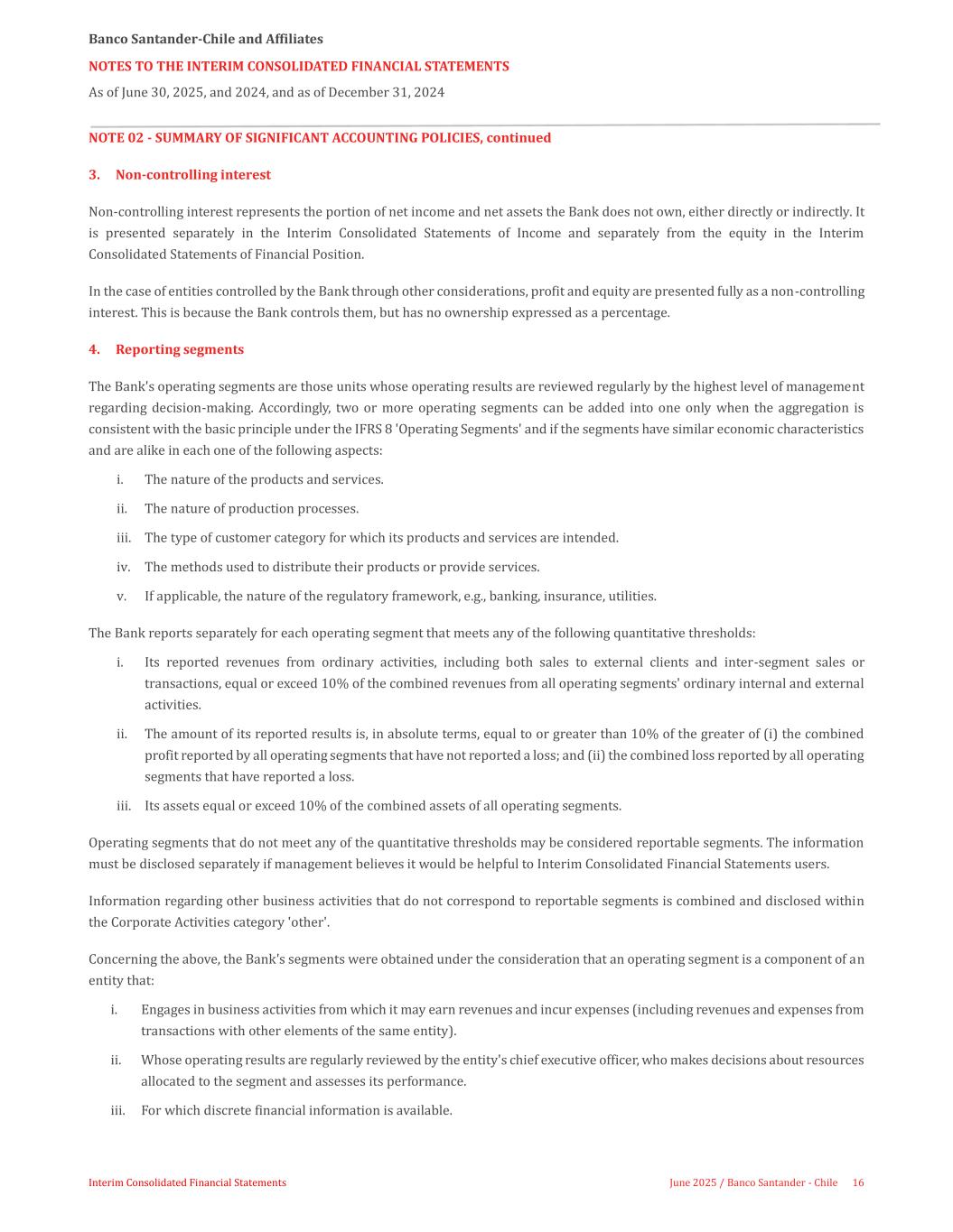Banco Santander-Chile and Affiliates NOTES TO THE INTERIM CONSOLIDATED FINANCIAL STATEMENTS As of June 30, 2025, and 2024, and as of December 31, 2024 Interim Consolidated Financial Statements June 2025 / Banco Santander - Chile 16 NOTE 02 - SUMMARY OF SIGNIFICANT ACCOUNTING POLICIES, continued 3. Non-controlling interest Non-controlling interest represents the portion of net income and net assets the Bank does not own, either directly or indirectly. It is presented separately in the Interim Consolidated Statements of Income and separately from the equity in the Interim Consolidated Statements of Financial Position. In the case of entities controlled by the Bank through other considerations, profit and equity are presented fully as a non-controlling interest. This is because the Bank controls them, but has no ownership expressed as a percentage. 4. Reporting segments The Bank's operating segments are those units whose operating results are reviewed regularly by the highest level of management regarding decision-making. Accordingly, two or more operating segments can be added into one only when the aggregation is consistent with the basic principle under the IFRS 8 'Operating Segments' and if the segments have similar economic characteristics and are alike in each one of the following aspects: i. The nature of the products and services. ii. The nature of production processes. iii. The type of customer category for which its products and services are intended. iv. The methods used to distribute their products or provide services. v. If applicable, the nature of the regulatory framework, e.g., banking, insurance, utilities. The Bank reports separately for each operating segment that meets any of the following quantitative thresholds: i. Its reported revenues from ordinary activities, including both sales to external clients and inter-segment sales or transactions, equal or exceed 10% of the combined revenues from all operating segments' ordinary internal and external activities. ii. The amount of its reported results is, in absolute terms, equal to or greater than 10% of the greater of (i) the combined profit reported by all operating segments that have not reported a loss; and (ii) the combined loss reported by all operating segments that have reported a loss. iii. Its assets equal or exceed 10% of the combined assets of all operating segments. Operating segments that do not meet any of the quantitative thresholds may be considered reportable segments. The information must be disclosed separately if management believes it would be helpful to Interim Consolidated Financial Statements users. Information regarding other business activities that do not correspond to reportable segments is combined and disclosed within the Corporate Activities category 'other'. Concerning the above, the Bank's segments were obtained under the consideration that an operating segment is a component of an entity that: i. Engages in business activities from which it may earn revenues and incur expenses (including revenues and expenses from transactions with other elements of the same entity). ii. Whose operating results are regularly reviewed by the entity's chief executive officer, who makes decisions about resources allocated to the segment and assesses its performance. iii. For which discrete financial information is available.