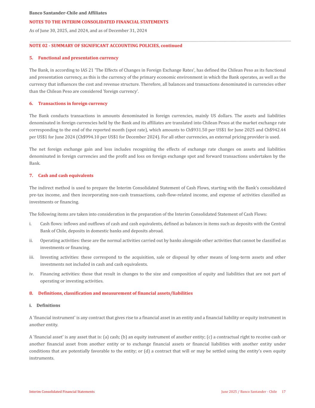 Banco Santander-Chile and Affiliates NOTES TO THE INTERIM CONSOLIDATED FINANCIAL STATEMENTS As of June 30, 2025, and 2024, and as of December 31, 2024 Interim Consolidated Financial Statements June 2025 / Banco Santander - Chile 17 NOTE 02 - SUMMARY OF SIGNIFICANT ACCOUNTING POLICIES, continued 5. Functional and presentation currency The Bank, in according to IAS 21 'The Effects of Changes in Foreign Exchange Rates', has defined the Chilean Peso as its functional and presentation currency, as this is the currency of the primary economic environment in which the Bank operates, as well as the currency that influences the cost and revenue structure. Therefore, all balances and transactions denominated in currencies other than the Chilean Peso are considered 'foreign currency'. 6. Transactions in foreign currency The Bank conducts transactions in amounts denominated in foreign currencies, mainly US dollars. The assets and liabilities denominated in foreign currencies held by the Bank and its affiliates are translated into Chilean Pesos at the market exchange rate corresponding to the end of the reported month (spot rate), which amounts to Ch$931.50 per US$1 for June 2025 and Ch$942.44 per US$1 for June 2024 (Ch$994.10 per US$1 for December 2024). For all other currencies, an external pricing provider is used. The net foreign exchange gain and loss includes recognizing the effects of exchange rate changes on assets and liabilities denominated in foreign currencies and the profit and loss on foreign exchange spot and forward transactions undertaken by the Bank. 7. Cash and cash equivalents The indirect method is used to prepare the Interim Consolidated Statement of Cash Flows, starting with the Bank's consolidated pre-tax income, and then incorporating non-cash transactions, cash-flow-related income, and expense of activities classified as investments or financing. The following items are taken into consideration in the preparation of the Interim Consolidated Statement of Cash Flows: i. Cash flows: inflows and outflows of cash and cash equivalents, defined as balances in items such as deposits with the Central Bank of Chile, deposits in domestic banks and deposits abroad. ii. Operating activities: these are the normal activities carried out by banks alongside other activities that cannot be classified as investments or financing. iii. Investing activities: these correspond to the acquisition, sale or disposal by other means of long-term assets and other investments not included in cash and cash equivalents. iv. Financing activities: those that result in changes to the size and composition of equity and liabilities that are not part of operating or investing activities. 8. Definitions, classification and measurement of financial assets/liabilities i. Definitions A 'financial instrument' is any contract that gives rise to a financial asset in an entity and a financial liability or equity instrument in another entity. A 'financial asset' is any asset that is: (a) cash; (b) an equity instrument of another entity; (c) a contractual right to receive cash or another financial asset from another entity or to exchange financial assets or financial liabilities with another entity under conditions that are potentially favorable to the entity; or (d) a contract that will or may be settled using the entity's own equity instruments.