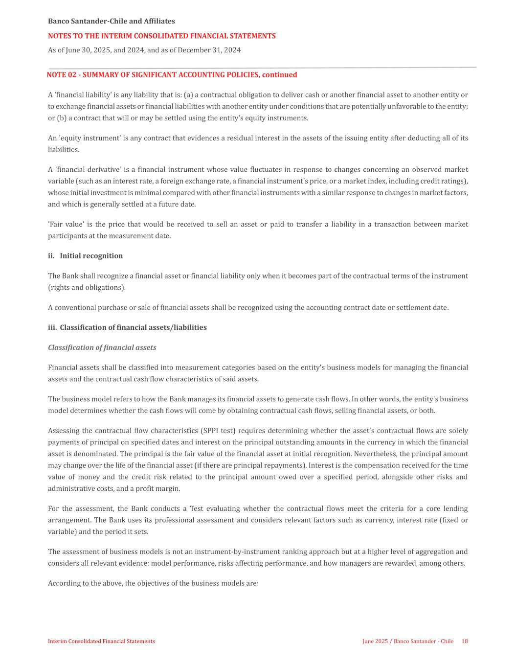 Banco Santander-Chile and Affiliates NOTES TO THE INTERIM CONSOLIDATED FINANCIAL STATEMENTS As of June 30, 2025, and 2024, and as of December 31, 2024 Interim Consolidated Financial Statements June 2025 / Banco Santander - Chile 18 NOTE 02 - SUMMARY OF SIGNIFICANT ACCOUNTING POLICIES, continued A 'financial liability' is any liability that is: (a) a contractual obligation to deliver cash or another financial asset to another entity or to exchange financial assets or financial liabilities with another entity under conditions that are potentially unfavorable to the entity; or (b) a contract that will or may be settled using the entity's equity instruments. An 'equity instrument' is any contract that evidences a residual interest in the assets of the issuing entity after deducting all of its liabilities. A 'financial derivative' is a financial instrument whose value fluctuates in response to changes concerning an observed market variable (such as an interest rate, a foreign exchange rate, a financial instrument's price, or a market index, including credit ratings), whose initial investment is minimal compared with other financial instruments with a similar response to changes in market factors, and which is generally settled at a future date. 'Fair value' is the price that would be received to sell an asset or paid to transfer a liability in a transaction between market participants at the measurement date. ii. Initial recognition The Bank shall recognize a financial asset or financial liability only when it becomes part of the contractual terms of the instrument (rights and obligations). A conventional purchase or sale of financial assets shall be recognized using the accounting contract date or settlement date. iii. Classification of financial assets/liabilities Classification of financial assets Financial assets shall be classified into measurement categories based on the entity's business models for managing the financial assets and the contractual cash flow characteristics of said assets. The business model refers to how the Bank manages its financial assets to generate cash flows. In other words, the entity's business model determines whether the cash flows will come by obtaining contractual cash flows, selling financial assets, or both. Assessing the contractual flow characteristics (SPPI test) requires determining whether the asset's contractual flows are solely payments of principal on specified dates and interest on the principal outstanding amounts in the currency in which the financial asset is denominated. The principal is the fair value of the financial asset at initial recognition. Nevertheless, the principal amount may change over the life of the financial asset (if there are principal repayments). Interest is the compensation received for the time value of money and the credit risk related to the principal amount owed over a specified period, alongside other risks and administrative costs, and a profit margin. For the assessment, the Bank conducts a Test evaluating whether the contractual flows meet the criteria for a core lending arrangement. The Bank uses its professional assessment and considers relevant factors such as currency, interest rate (fixed or variable) and the period it sets. The assessment of business models is not an instrument-by-instrument ranking approach but at a higher level of aggregation and considers all relevant evidence: model performance, risks affecting performance, and how managers are rewarded, among others. According to the above, the objectives of the business models are: