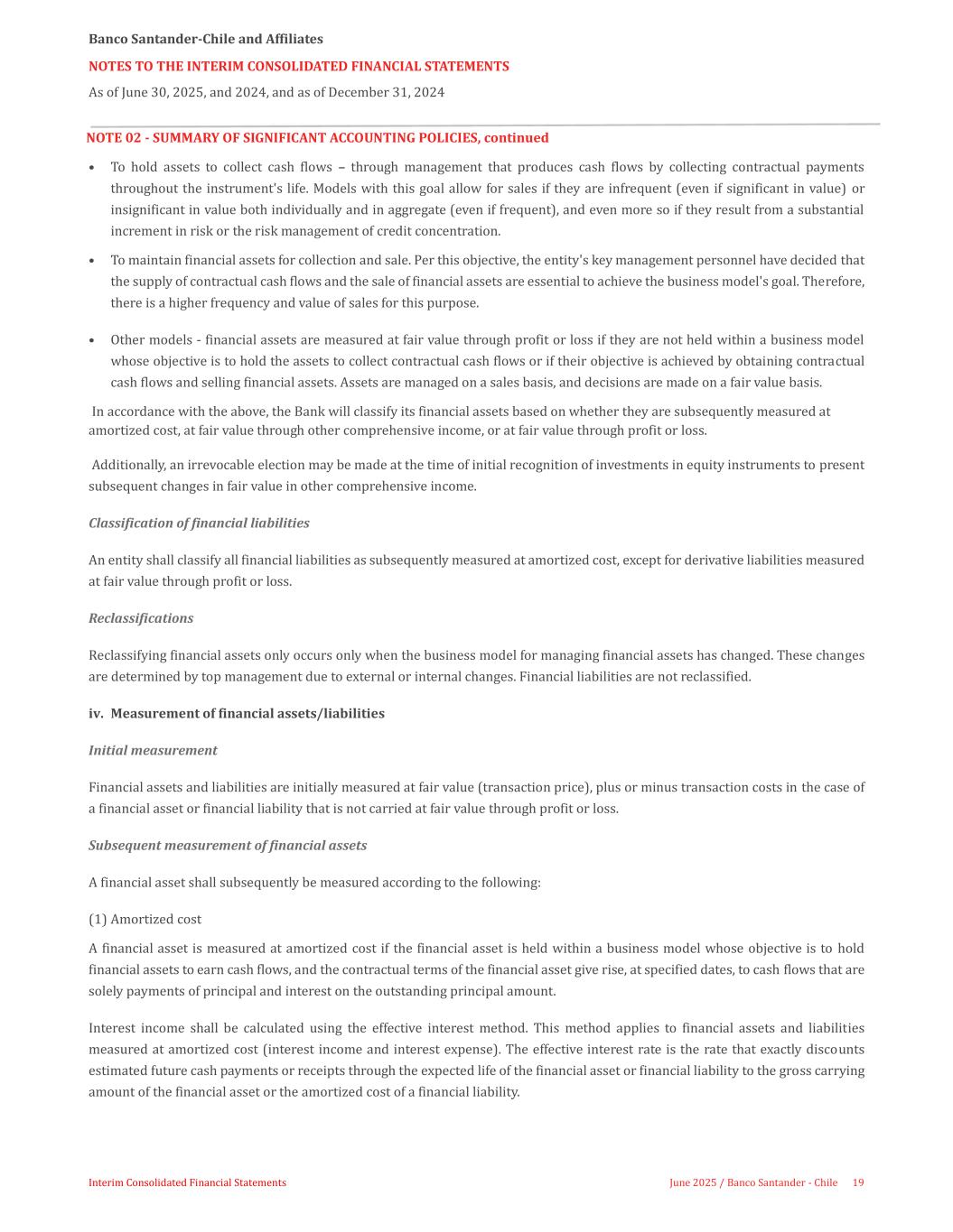 Banco Santander-Chile and Affiliates NOTES TO THE INTERIM CONSOLIDATED FINANCIAL STATEMENTS As of June 30, 2025, and 2024, and as of December 31, 2024 Interim Consolidated Financial Statements June 2025 / Banco Santander - Chile 19 NOTE 02 - SUMMARY OF SIGNIFICANT ACCOUNTING POLICIES, continued To hold assets to collect cash flows through management that produces cash flows by collecting contractual payments throughout the instrument's life. Models with this goal allow for sales if they are infrequent (even if significant in value) or insignificant in value both individually and in aggregate (even if frequent), and even more so if they result from a substantial increment in risk or the risk management of credit concentration. To maintain financial assets for collection and sale. Per this objective, the entity's key management personnel have decided that the supply of contractual cash flows and the sale of financial assets are essential to achieve the business model's goal. Therefore, there is a higher frequency and value of sales for this purpose. Other models - financial assets are measured at fair value through profit or loss if they are not held within a business model whose objective is to hold the assets to collect contractual cash flows or if their objective is achieved by obtaining contractual cash flows and selling financial assets. Assets are managed on a sales basis, and decisions are made on a fair value basis. In accordance with the above, the Bank will classify its financial assets based on whether they are subsequently measured at amortized cost, at fair value through other comprehensive income, or at fair value through profit or loss. Additionally, an irrevocable election may be made at the time of initial recognition of investments in equity instruments to present subsequent changes in fair value in other comprehensive income. Classification of financial liabilities An entity shall classify all financial liabilities as subsequently measured at amortized cost, except for derivative liabilities measured at fair value through profit or loss. Reclassifications Reclassifying financial assets only occurs only when the business model for managing financial assets has changed. These changes are determined by top management due to external or internal changes. Financial liabilities are not reclassified. iv. Measurement of financial assets/liabilities Initial measurement Financial assets and liabilities are initially measured at fair value (transaction price), plus or minus transaction costs in the case of a financial asset or financial liability that is not carried at fair value through profit or loss. Subsequent measurement of financial assets A financial asset shall subsequently be measured according to the following: (1) Amortized cost A financial asset is measured at amortized cost if the financial asset is held within a business model whose objective is to hold financial assets to earn cash flows, and the contractual terms of the financial asset give rise, at specified dates, to cash flows that are solely payments of principal and interest on the outstanding principal amount. Interest income shall be calculated using the effective interest method. This method applies to financial assets and liabilities measured at amortized cost (interest income and interest expense). The effective interest rate is the rate that exactly discounts estimated future cash payments or receipts through the expected life of the financial asset or financial liability to the gross carrying amount of the financial asset or the amortized cost of a financial liability.