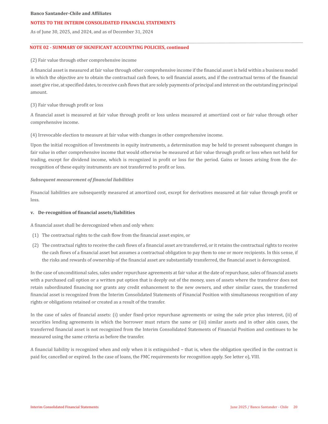 Banco Santander-Chile and Affiliates NOTES TO THE INTERIM CONSOLIDATED FINANCIAL STATEMENTS As of June 30, 2025, and 2024, and as of December 31, 2024 Interim Consolidated Financial Statements June 2025 / Banco Santander - Chile 20 NOTE 02 - SUMMARY OF SIGNIFICANT ACCOUNTING POLICIES, continued (2) Fair value through other comprehensive income A financial asset is measured at fair value through other comprehensive income if the financial asset is held within a business model in which the objective are to obtain the contractual cash flows, to sell financial assets, and if the contractual terms of the financial asset give rise, at specified dates, to receive cash flows that are solely payments of principal and interest on the outstanding principal amount. (3) Fair value through profit or loss A financial asset is measured at fair value through profit or loss unless measured at amortized cost or fair value through other comprehensive income. (4) Irrevocable election to measure at fair value with changes in other comprehensive income. Upon the initial recognition of Investments in equity instruments, a determination may be held to present subsequent changes in fair value in other comprehensive income that would otherwise be measured at fair value through profit or loss when not held for trading, except for dividend income, which is recognized in profit or loss for the period. Gains or losses arising from the de- recognition of these equity instruments are not transferred to profit or loss. Subsequent measurement of financial liabilities Financial liabilities are subsequently measured at amortized cost, except for derivatives measured at fair value through profit or loss. v. De-recognition of financial assets/liabilities A financial asset shall be derecognized when and only when: (1) The contractual rights to the cash flow from the financial asset expire, or (2) The contractual rights to receive the cash flows of a financial asset are transferred, or it retains the contractual rights to receive the cash flows of a financial asset but assumes a contractual obligation to pay them to one or more recipients. In this sense, if the risks and rewards of ownership of the financial asset are substantially transferred, the financial asset is derecognized. In the case of unconditional sales, sales under repurchase agreements at fair value at the date of repurchase, sales of financial assets with a purchased call option or a written put option that is deeply out of the money, uses of assets where the transferor does not retain subordinated financing nor grants any credit enhancement to the new owners, and other similar cases, the transferred financial asset is recognized from the Interim Consolidated Statements of Financial Position with simultaneous recognition of any rights or obligations retained or created as a result of the transfer. In the case of sales of financial assets: (i) under fixed-price repurchase agreements or using the sale price plus interest, (ii) of securities lending agreements in which the borrower must return the same or (iii) similar assets and in other akin cases, the transferred financial asset is not recognized from the Interim Consolidated Statements of Financial Position and continues to be measured using the same criteria as before the transfer. A financial liability is recognized when and only when it is extinguished that is, when the obligation specified in the contract is paid for, cancelled or expired. In the case of loans, the FMC requirements for recognition apply. See letter o), VIII.