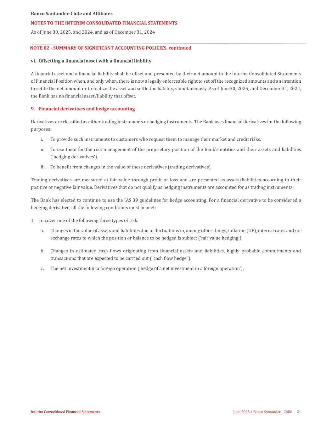 Banco Santander-Chile and Affiliates NOTES TO THE INTERIM CONSOLIDATED FINANCIAL STATEMENTS As of June 30, 2025, and 2024, and as of December 31, 2024 Interim Consolidated Financial Statements June 2025 / Banco Santander - Chile 21 NOTE 02 - SUMMARY OF SIGNIFICANT ACCOUNTING POLICIES, continued vi. Offsetting a financial asset with a financial liability A financial asset and a financial liability shall be offset and presented by their net amount in the Interim Consolidated Statements of Financial Position when, and only when, there is now a legally enforceable right to set off the recognized amounts and an intention to settle the net amount or to realize the asset and settle the liability, simultaneously. As of June30, 2025, and December 31, 2024, the Bank has no financial asset/liability that offset. 9. Financial derivatives and hedge accounting Derivatives are classified as either trading instruments or hedging instruments. The Bank uses financial derivatives for the following purposes: i. To provide such instruments to customers who request them to manage their market and credit risks. ii. To use them for the risk management of the proprietary position of the Bank's entities and their assets and liabilities ('hedging derivatives'). iii. To benefit from changes in the value of these derivatives (trading derivatives). Trading derivatives are measured at fair value through profit or loss and are presented as assets/liabilities according to their positive or negative fair value. Derivatives that do not qualify as hedging instruments are accounted for as trading instruments. The Bank has elected to continue to use the IAS 39 guidelines for hedge accounting. For a financial derivative to be considered a hedging derivative, all the following conditions must be met: 1. To cover one of the following three types of risk: a. Changes in the value of assets and liabilities due to fluctuations in, among other things, inflation (UF), interest rates and/or exchange rates to which the position or balance to be hedged is subject ('fair value hedging'). b. Changes in estimated cash flows originating from financial assets and liabilities, highly probable commitments and transactions that are expected to be carried out ("cash flow hedge"). c. The net investment in a foreign operation ('hedge of a net investment in a foreign operation').