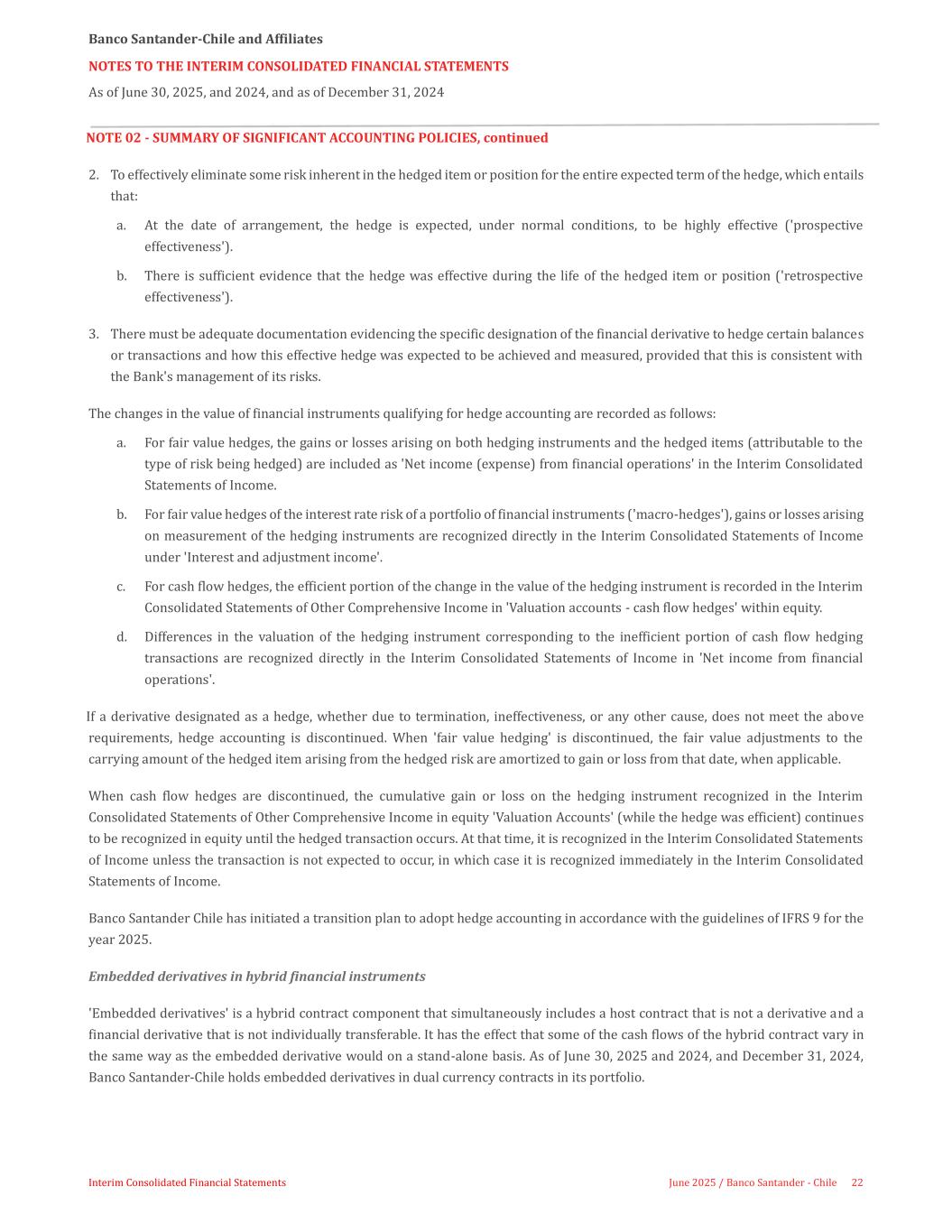 Banco Santander-Chile and Affiliates NOTES TO THE INTERIM CONSOLIDATED FINANCIAL STATEMENTS As of June 30, 2025, and 2024, and as of December 31, 2024 Interim Consolidated Financial Statements June 2025 / Banco Santander - Chile 22 NOTE 02 - SUMMARY OF SIGNIFICANT ACCOUNTING POLICIES, continued 2. To effectively eliminate some risk inherent in the hedged item or position for the entire expected term of the hedge, which entails that: a. At the date of arrangement, the hedge is expected, under normal conditions, to be highly effective ('prospective effectiveness'). b. There is sufficient evidence that the hedge was effective during the life of the hedged item or position ('retrospective effectiveness'). 3. There must be adequate documentation evidencing the specific designation of the financial derivative to hedge certain balances or transactions and how this effective hedge was expected to be achieved and measured, provided that this is consistent with the Bank's management of its risks. The changes in the value of financial instruments qualifying for hedge accounting are recorded as follows: a. For fair value hedges, the gains or losses arising on both hedging instruments and the hedged items (attributable to the type of risk being hedged) are included as 'Net income (expense) from financial operations' in the Interim Consolidated Statements of Income. b. For fair value hedges of the interest rate risk of a portfolio of financial instruments ('macro-hedges'), gains or losses arising on measurement of the hedging instruments are recognized directly in the Interim Consolidated Statements of Income under 'Interest and adjustment income'. c. For cash flow hedges, the efficient portion of the change in the value of the hedging instrument is recorded in the Interim Consolidated Statements of Other Comprehensive Income in 'Valuation accounts - cash flow hedges' within equity. d. Differences in the valuation of the hedging instrument corresponding to the inefficient portion of cash flow hedging transactions are recognized directly in the Interim Consolidated Statements of Income in 'Net income from financial operations'. If a derivative designated as a hedge, whether due to termination, ineffectiveness, or any other cause, does not meet the above requirements, hedge accounting is discontinued. When 'fair value hedging' is discontinued, the fair value adjustments to the carrying amount of the hedged item arising from the hedged risk are amortized to gain or loss from that date, when applicable. When cash flow hedges are discontinued, the cumulative gain or loss on the hedging instrument recognized in the Interim Consolidated Statements of Other Comprehensive Income in equity 'Valuation Accounts' (while the hedge was efficient) continues to be recognized in equity until the hedged transaction occurs. At that time, it is recognized in the Interim Consolidated Statements of Income unless the transaction is not expected to occur, in which case it is recognized immediately in the Interim Consolidated Statements of Income. Banco Santander Chile has initiated a transition plan to adopt hedge accounting in accordance with the guidelines of IFRS 9 for the year 2025. Embedded derivatives in hybrid financial instruments 'Embedded derivatives' is a hybrid contract component that simultaneously includes a host contract that is not a derivative and a financial derivative that is not individually transferable. It has the effect that some of the cash flows of the hybrid contract vary in the same way as the embedded derivative would on a stand-alone basis. As of June 30, 2025 and 2024, and December 31, 2024, Banco Santander-Chile holds embedded derivatives in dual currency contracts in its portfolio.
