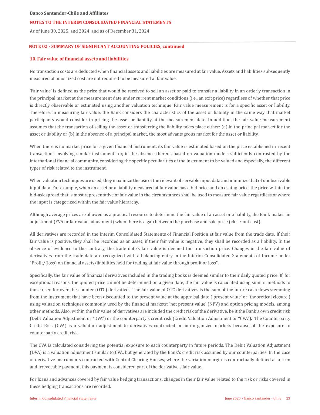 Banco Santander-Chile and Affiliates NOTES TO THE INTERIM CONSOLIDATED FINANCIAL STATEMENTS As of June 30, 2025, and 2024, and as of December 31, 2024 Interim Consolidated Financial Statements June 2025 / Banco Santander - Chile 23 NOTE 02 - SUMMARY OF SIGNIFICANT ACCOUNTING POLICIES, continued 10. Fair value of financial assets and liabilities No transaction costs are deducted when financial assets and liabilities are measured at fair value. Assets and liabilities subsequently measured at amortized cost are not required to be measured at fair value. 'Fair value' is defined as the price that would be received to sell an asset or paid to transfer a liability in an orderly transaction in the principal market at the measurement date under current market conditions (i.e., an exit price) regardless of whether that price is directly observable or estimated using another valuation technique. Fair value measurement is for a specific asset or liability. Therefore, in measuring fair value, the Bank considers the characteristics of the asset or liability in the same way that market participants would consider in pricing the asset or liability at the measurement date. In addition, the fair value measurement assumes that the transaction of selling the asset or transferring the liability takes place either: (a) in the principal market for the asset or liability or (b) in the absence of a principal market, the most advantageous market for the asset or liability. When there is no market price for a given financial instrument, its fair value is estimated based on the price established in recent transactions involving similar instruments or, in the absence thereof, based on valuation models sufficiently contrasted by the international financial community, considering the specific peculiarities of the instrument to be valued and especially, the different types of risk related to the instrument. When valuation techniques are used, they maximize the use of the relevant observable input data and minimize that of unobservable input data. For example, when an asset or a liability measured at fair value has a bid price and an asking price, the price within the bid-ask spread that is most representative of fair value in the circumstances shall be used to measure fair value regardless of where the input is categorized within the fair value hierarchy. Although average prices are allowed as a practical resource to determine the fair value of an asset or a liability, the Bank makes an adjustment (FVA or fair value adjustment) when there is a gap between the purchase and sale price (close-out cost). All derivatives are recorded in the Interim Consolidated Statements of Financial Position at fair value from the trade date. If their fair value is positive, they shall be recorded as an asset; if their fair value is negative, they shall be recorded as a liability. In the absence of evidence to the contrary, the trade date's fair value is deemed the transaction price. Changes in the fair value of derivatives from the trade date are recognized with a balancing entry in the Interim Consolidated Statements of Income under "Profit/(loss) on financial assets/liabilities held for trading at fair value through profit or loss". Specifically, the fair value of financial derivatives included in the trading books is deemed similar to their daily quoted price. If, for exceptional reasons, the quoted price cannot be determined on a given date, the fair value is calculated using similar methods to those used for over-the-counter (OTC) derivatives. The fair value of OTC derivatives is the sum of the future cash flows stemming from the instrument that have been discounted to the present value at the appraisal date ('present value' or 'theoretical closure') using valuation techniques commonly used by the financial markets: 'net present value' (NPV) and option pricing models, among other methods. Also, within the fair value of derivatives are included the credit risk of the derivative, be it rty Credit Risk (CVA) is a valuation adjustment to derivatives contracted in non-organized markets because of the exposure to counterparty credit risk. The CVA is calculated considering the potential exposure to each counterparty in future periods. The Debit Valuation Adjustment (DVA) is a valuation adjustment similar to CVA, but generated by the Bank's credit risk assumed by our counterparties. In the case of derivative instruments contracted with Central Clearing Houses, where the variation margin is contractually defined as a firm and irrevocable payment, this payment is considered part of the derivative's fair value. For loans and advances covered by fair value hedging transactions, changes in their fair value related to the risk or risks covered in these hedging transactions are recorded.