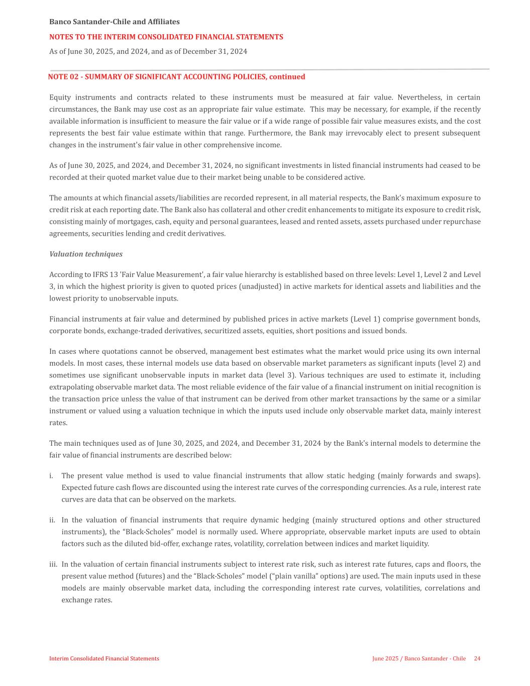 Banco Santander-Chile and Affiliates NOTES TO THE INTERIM CONSOLIDATED FINANCIAL STATEMENTS As of June 30, 2025, and 2024, and as of December 31, 2024 Interim Consolidated Financial Statements June 2025 / Banco Santander - Chile 24 NOTE 02 - SUMMARY OF SIGNIFICANT ACCOUNTING POLICIES, continued Equity instruments and contracts related to these instruments must be measured at fair value. Nevertheless, in certain circumstances, the Bank may use cost as an appropriate fair value estimate. This may be necessary, for example, if the recently available information is insufficient to measure the fair value or if a wide range of possible fair value measures exists, and the cost represents the best fair value estimate within that range. Furthermore, the Bank may irrevocably elect to present subsequent changes in the instrument's fair value in other comprehensive income. As of June 30, 2025, and 2024, and December 31, 2024, no significant investments in listed financial instruments had ceased to be recorded at their quoted market value due to their market being unable to be considered active. The amounts at which financial assets/liabilities are recorded represent, in all material respects, the Bank's maximum exposure to credit risk at each reporting date. The Bank also has collateral and other credit enhancements to mitigate its exposure to credit risk, consisting mainly of mortgages, cash, equity and personal guarantees, leased and rented assets, assets purchased under repurchase agreements, securities lending and credit derivatives. Valuation techniques According to IFRS 13 'Fair Value Measurement', a fair value hierarchy is established based on three levels: Level 1, Level 2 and Level 3, in which the highest priority is given to quoted prices (unadjusted) in active markets for identical assets and liabilities and the lowest priority to unobservable inputs. Financial instruments at fair value and determined by published prices in active markets (Level 1) comprise government bonds, corporate bonds, exchange-traded derivatives, securitized assets, equities, short positions and issued bonds. In cases where quotations cannot be observed, management best estimates what the market would price using its own internal models. In most cases, these internal models use data based on observable market parameters as significant inputs (level 2) and sometimes use significant unobservable inputs in market data (level 3). Various techniques are used to estimate it, including extrapolating observable market data. The most reliable evidence of the fair value of a financial instrument on initial recognition is the transaction price unless the value of that instrument can be derived from other market transactions by the same or a similar instrument or valued using a valuation technique in which the inputs used include only observable market data, mainly interest rates. The main techniques used as of June 30, 2025, and 2024, and December 31, 2024 by the Bank's internal models to determine the fair value of financial instruments are described below: i. The present value method is used to value financial instruments that allow static hedging (mainly forwards and swaps). Expected future cash flows are discounted using the interest rate curves of the corresponding currencies. As a rule, interest rate curves are data that can be observed on the markets. ii. In the valuation of financial instruments that require dynamic hedging (mainly structured options and other structured - factors such as the diluted bid-offer, exchange rates, volatility, correlation between indices and market liquidity. iii. In the valuation of certain financial instruments subject to interest rate risk, such as interest rate futures, caps and floors, the - ese models are mainly observable market data, including the corresponding interest rate curves, volatilities, correlations and exchange rates.