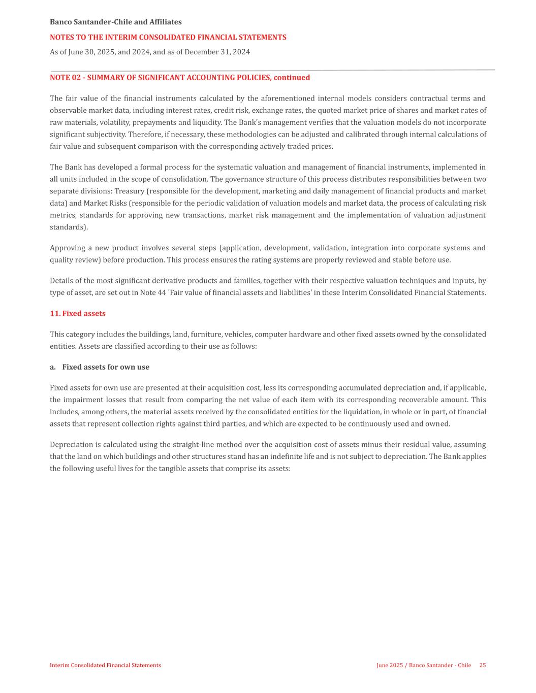 Banco Santander-Chile and Affiliates NOTES TO THE INTERIM CONSOLIDATED FINANCIAL STATEMENTS As of June 30, 2025, and 2024, and as of December 31, 2024 Interim Consolidated Financial Statements June 2025 / Banco Santander - Chile 25 NOTE 02 - SUMMARY OF SIGNIFICANT ACCOUNTING POLICIES, continued The fair value of the financial instruments calculated by the aforementioned internal models considers contractual terms and observable market data, including interest rates, credit risk, exchange rates, the quoted market price of shares and market rates of raw materials, volatility, prepayments and liquidity. The Bank's management verifies that the valuation models do not incorporate significant subjectivity. Therefore, if necessary, these methodologies can be adjusted and calibrated through internal calculations of fair value and subsequent comparison with the corresponding actively traded prices. The Bank has developed a formal process for the systematic valuation and management of financial instruments, implemented in all units included in the scope of consolidation. The governance structure of this process distributes responsibilities between two separate divisions: Treasury (responsible for the development, marketing and daily management of financial products and market data) and Market Risks (responsible for the periodic validation of valuation models and market data, the process of calculating risk metrics, standards for approving new transactions, market risk management and the implementation of valuation adjustment standards). Approving a new product involves several steps (application, development, validation, integration into corporate systems and quality review) before production. This process ensures the rating systems are properly reviewed and stable before use. Details of the most significant derivative products and families, together with their respective valuation techniques and inputs, by type of asset, are set out in Note 44 'Fair value of financial assets and liabilities' in these Interim Consolidated Financial Statements. 11. Fixed assets This category includes the buildings, land, furniture, vehicles, computer hardware and other fixed assets owned by the consolidated entities. Assets are classified according to their use as follows: a. Fixed assets for own use Fixed assets for own use are presented at their acquisition cost, less its corresponding accumulated depreciation and, if applicable, the impairment losses that result from comparing the net value of each item with its corresponding recoverable amount. This includes, among others, the material assets received by the consolidated entities for the liquidation, in whole or in part, of financial assets that represent collection rights against third parties, and which are expected to be continuously used and owned. Depreciation is calculated using the straight-line method over the acquisition cost of assets minus their residual value, assuming that the land on which buildings and other structures stand has an indefinite life and is not subject to depreciation. The Bank applies the following useful lives for the tangible assets that comprise its assets: