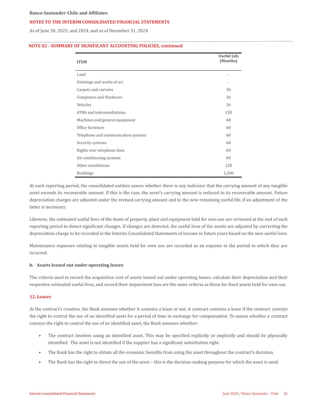 Banco Santander-Chile and Affiliates NOTES TO THE INTERIM CONSOLIDATED FINANCIAL STATEMENTS As of June 30, 2025, and 2024, and as of December 31, 2024 Interim Consolidated Financial Statements June 2025 / Banco Santander - Chile 26 NOTE 02 - SUMMARY OF SIGNIFICANT ACCOUNTING POLICIES, continued ITEM Useful Life (Months) Land - Paintings and works of art - Carpets and curtains 36 Computers and Hardware 36 Vehicles 36 ATMs and teleconsultations 120 Machines and general equipment 60 Office furniture 60 Telephone and communication systems 60 Security systems 60 Rights over telephone lines 64 Air conditioning systems 84 Other installations 120 Buildings 1,200 At each reporting period, the consolidated entities assess whether there is any indicator that the carrying amount of any tangible asset exceeds its recoverable amount. If this is the case, the asset's carrying amount is reduced to its recoverable amount. Future depreciation charges are adjusted under the revised carrying amount and to the new remaining useful life, if an adjustment of the latter is necessary. Likewise, the estimated useful lives of the items of property, plant and equipment held for own use are reviewed at the end of each reporting period to detect significant changes. If changes are detected, the useful lives of the assets are adjusted by correcting the depreciation charge to be recorded in the Interim Consolidated Statements of Income in future years based on the new useful lives. Maintenance expenses relating to tangible assets held for own use are recorded as an expense in the period in which they are incurred. b. Assets leased out under operating leases The criteria used to record the acquisition cost of assets leased out under operating leases, calculate their depreciation and their respective estimated useful lives, and record their impairment loss are the same criteria as those for fixed assets held for own use. 12. Leases At the contract's creation, the Bank assesses whether it contains a lease or not. A contract contains a lease if the contract conveys the right to control the use of an identified asset for a period of time in exchange for compensation. To assess whether a contract conveys the right to control the use of an identified asset, the Bank assesses whether: The contract involves using an identified asset. This may be specified explicitly or implicitly and should be physically identified. The asset is not identified if the supplier has a significant substitution right. The Bank has the right to obtain all the economic benefits from using the asset throughout the contract's duration. The Bank has the right to direct the use of the asset this is the decision-making purpose for which the asset is used.