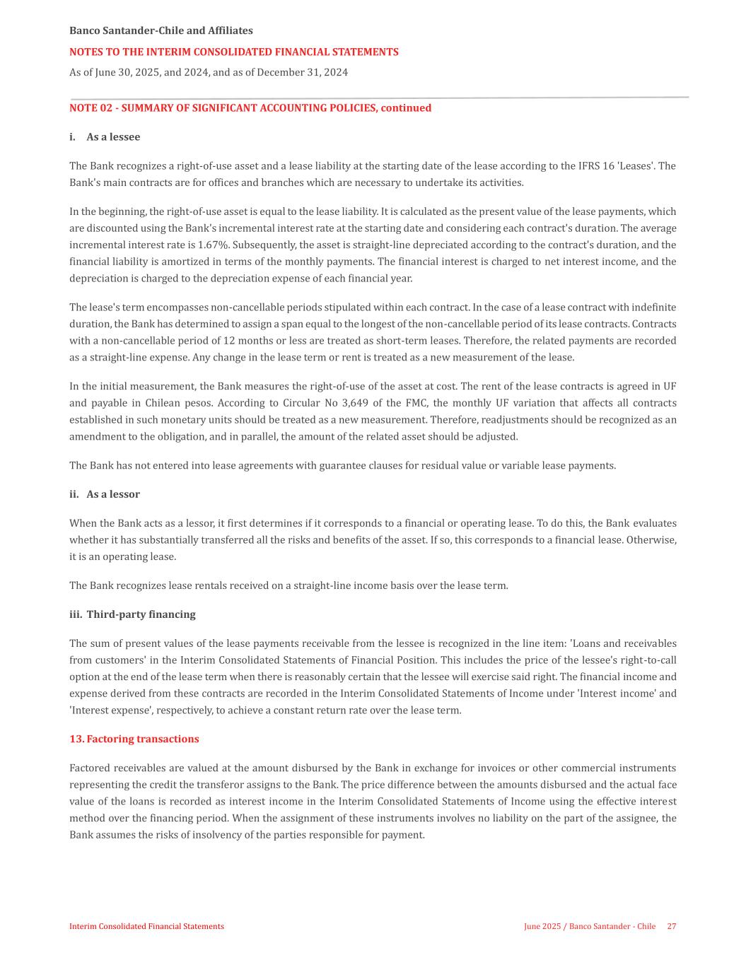 Banco Santander-Chile and Affiliates NOTES TO THE INTERIM CONSOLIDATED FINANCIAL STATEMENTS As of June 30, 2025, and 2024, and as of December 31, 2024 Interim Consolidated Financial Statements June 2025 / Banco Santander - Chile 27 NOTE 02 - SUMMARY OF SIGNIFICANT ACCOUNTING POLICIES, continued i. As a lessee The Bank recognizes a right-of-use asset and a lease liability at the starting date of the lease according to the IFRS 16 'Leases'. The Bank's main contracts are for offices and branches which are necessary to undertake its activities. In the beginning, the right-of-use asset is equal to the lease liability. It is calculated as the present value of the lease payments, which are discounted using the Bank's incremental interest rate at the starting date and considering each contract's duration. The average incremental interest rate is 1.67%. Subsequently, the asset is straight-line depreciated according to the contract's duration, and the financial liability is amortized in terms of the monthly payments. The financial interest is charged to net interest income, and the depreciation is charged to the depreciation expense of each financial year. The lease's term encompasses non-cancellable periods stipulated within each contract. In the case of a lease contract with indefinite duration, the Bank has determined to assign a span equal to the longest of the non-cancellable period of its lease contracts. Contracts with a non-cancellable period of 12 months or less are treated as short-term leases. Therefore, the related payments are recorded as a straight-line expense. Any change in the lease term or rent is treated as a new measurement of the lease. In the initial measurement, the Bank measures the right-of-use of the asset at cost. The rent of the lease contracts is agreed in UF and payable in Chilean pesos. According to Circular No 3,649 of the FMC, the monthly UF variation that affects all contracts established in such monetary units should be treated as a new measurement. Therefore, readjustments should be recognized as an amendment to the obligation, and in parallel, the amount of the related asset should be adjusted. The Bank has not entered into lease agreements with guarantee clauses for residual value or variable lease payments. ii. As a lessor When the Bank acts as a lessor, it first determines if it corresponds to a financial or operating lease. To do this, the Bank evaluates whether it has substantially transferred all the risks and benefits of the asset. If so, this corresponds to a financial lease. Otherwise, it is an operating lease. The Bank recognizes lease rentals received on a straight-line income basis over the lease term. iii. Third-party financing The sum of present values of the lease payments receivable from the lessee is recognized in the line item: 'Loans and receivables from customers' in the Interim Consolidated Statements of Financial Position. This includes the price of the lessee's right-to-call option at the end of the lease term when there is reasonably certain that the lessee will exercise said right. The financial income and expense derived from these contracts are recorded in the Interim Consolidated Statements of Income under 'Interest income' and 'Interest expense', respectively, to achieve a constant return rate over the lease term. 13. Factoring transactions Factored receivables are valued at the amount disbursed by the Bank in exchange for invoices or other commercial instruments representing the credit the transferor assigns to the Bank. The price difference between the amounts disbursed and the actual face value of the loans is recorded as interest income in the Interim Consolidated Statements of Income using the effective interest method over the financing period. When the assignment of these instruments involves no liability on the part of the assignee, the Bank assumes the risks of insolvency of the parties responsible for payment.