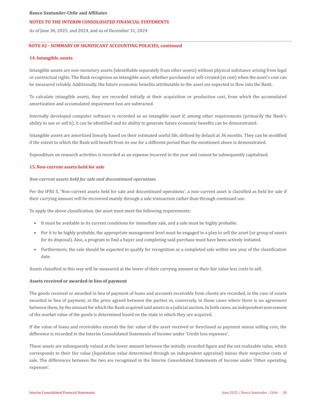 Banco Santander-Chile and Affiliates NOTES TO THE INTERIM CONSOLIDATED FINANCIAL STATEMENTS As of June 30, 2025, and 2024, and as of December 31, 2024 Interim Consolidated Financial Statements June 2025 / Banco Santander - Chile 28 NOTE 02 - SUMMARY OF SIGNIFICANT ACCOUNTING POLICIES, continued 14. Intangible assets Intangible assets are non-monetary assets (identifiable separately from other assets) without physical substance arising from legal or contractual rights. The Bank recognizes an intangible asset, whether purchased or self-created (at cost) when the asset's cost can be measured reliably. Additionally, the future economic benefits attributable to the asset are expected to flow into the Bank. To calculate intangible assets, they are recorded initially at their acquisition or production cost, from which the accumulated amortization and accumulated impairment loss are subtracted. Internally developed computer software is recorded as an intangible asset if, among other requirements (primarily the Bank's ability to use or sell it), it can be identified and its ability to generate future economic benefits can be demonstrated. Intangible assets are amortized linearly based on their estimated useful life, defined by default at 36 months. They can be modified if the extent to which the Bank will benefit from its use for a different period than the mentioned above is demonstrated. Expenditure on research activities is recorded as an expense incurred in the year and cannot be subsequently capitalized. 15. Non-current assets held for sale Non-current assets held for sale and discontinued operations Per the IFRS 5, 'Non-current assets held for sale and discontinued operations', a non-current asset is classified as held for sale if their carrying amount will be recovered mainly through a sale transaction rather than through continued use. To apply the above classification, the asset must meet the following requirements: It must be available in its current conditions for immediate sale, and a sale must be highly probable. For it to be highly probable, the appropriate management level must be engaged in a plan to sell the asset (or group of assets for its disposal). Also, a program to find a buyer and completing said purchase must have been actively initiated. Furthermore, the sale should be expected to qualify for recognition as a completed sale within one year of the classification date. Assets classified in this way will be measured at the lower of their carrying amount or their fair value less costs to sell. Assets received or awarded in lieu of payment The goods received or awarded in lieu of payment of loans and accounts receivable from clients are recorded, in the case of assets awarded in lieu of payment, at the price agreed between the parties or, conversely, in those cases where there is no agreement between them, by the amount for which the Bank acquired said assets in a judicial auction. In both cases, an independent assessment of the market value of the goods is determined based on the state in which they are acquired. If the value of loans and receivables exceeds the fair value of the asset received or foreclosed as payment minus selling cost, the difference is recorded in the Interim Consolidated Statements of Income under 'Credit loss expenses'. These assets are subsequently valued at the lower amount between the initially recorded figure and the net realizable value, which corresponds to their fair value (liquidation value determined through an independent appraisal) minus their respective costs of sale. The differences between the two are recognized in the Interim Consolidated Statements of Income under 'Other operating expenses'.