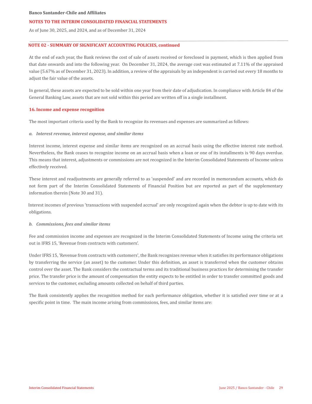 Banco Santander-Chile and Affiliates NOTES TO THE INTERIM CONSOLIDATED FINANCIAL STATEMENTS As of June 30, 2025, and 2024, and as of December 31, 2024 Interim Consolidated Financial Statements June 2025 / Banco Santander - Chile 29 NOTE 02 - SUMMARY OF SIGNIFICANT ACCOUNTING POLICIES, continued At the end of each year, the Bank reviews the cost of sale of assets received or foreclosed in payment, which is then applied from that date onwards and into the following year. On December 31, 2024, the average cost was estimated at 7.11% of the appraised value (5.67% as of December 31, 2023). In addition, a review of the appraisals by an independent is carried out every 18 months to adjust the fair value of the assets. In general, these assets are expected to be sold within one year from their date of adjudication. In compliance with Article 84 of the General Banking Law, assets that are not sold within this period are written off in a single installment. 16. Income and expense recognition The most important criteria used by the Bank to recognize its revenues and expenses are summarized as follows: a. Interest revenue, interest expense, and similar items Interest income, interest expense and similar items are recognized on an accrual basis using the effective interest rate method. Nevertheless, the Bank ceases to recognize income on an accrual basis when a loan or one of its installments is 90 days overdue. This means that interest, adjustments or commissions are not recognized in the Interim Consolidated Statements of Income unless effectively received. These interest and readjustments are generally referred to as 'suspended' and are recorded in memorandum accounts, which do not form part of the Interim Consolidated Statements of Financial Position but are reported as part of the supplementary information therein (Note 30 and 31). Interest incomes of previous 'transactions with suspended accrual' are only recognized again when the debtor is up to date with its obligations. b. Commissions, fees and similar items Fee and commission income and expenses are recognized in the Interim Consolidated Statements of Income using the criteria set Under IFRS 15, 'Revenue from contracts with customers', the Bank recognizes revenue when it satisfies its performance obligations by transferring the service (an asset) to the customer. Under this definition, an asset is transferred when the customer obtains control over the asset. The Bank considers the contractual terms and its traditional business practices for determining the transfer price. The transfer price is the amount of compensation the entity expects to be entitled in order to transfer committed goods and services to the customer, excluding amounts collected on behalf of third parties. The Bank consistently applies the recognition method for each performance obligation, whether it is satisfied over time or at a specific point in time. The main income arising from commissions, fees, and similar items are: