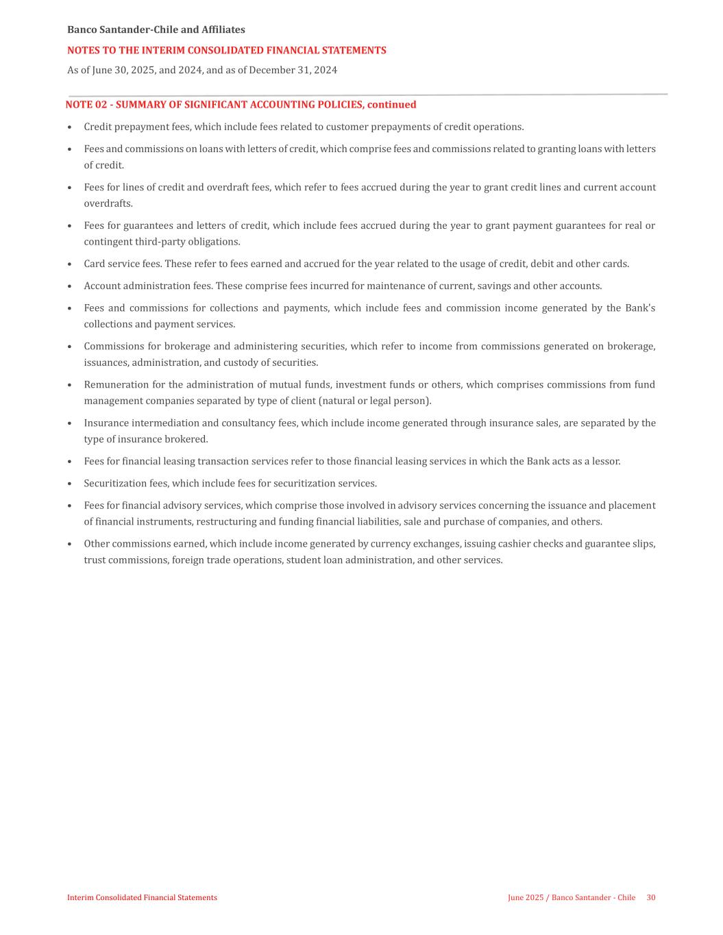 Banco Santander-Chile and Affiliates NOTES TO THE INTERIM CONSOLIDATED FINANCIAL STATEMENTS As of June 30, 2025, and 2024, and as of December 31, 2024 Interim Consolidated Financial Statements June 2025 / Banco Santander - Chile 30 NOTE 02 - SUMMARY OF SIGNIFICANT ACCOUNTING POLICIES, continued Credit prepayment fees, which include fees related to customer prepayments of credit operations. Fees and commissions on loans with letters of credit, which comprise fees and commissions related to granting loans with letters of credit. Fees for lines of credit and overdraft fees, which refer to fees accrued during the year to grant credit lines and current account overdrafts. Fees for guarantees and letters of credit, which include fees accrued during the year to grant payment guarantees for real or contingent third-party obligations. Card service fees. These refer to fees earned and accrued for the year related to the usage of credit, debit and other cards. Account administration fees. These comprise fees incurred for maintenance of current, savings and other accounts. Fees and commissions for collections and payments, which include fees and commission income generated by the Bank's collections and payment services. Commissions for brokerage and administering securities, which refer to income from commissions generated on brokerage, issuances, administration, and custody of securities. Remuneration for the administration of mutual funds, investment funds or others, which comprises commissions from fund management companies separated by type of client (natural or legal person). Insurance intermediation and consultancy fees, which include income generated through insurance sales, are separated by the type of insurance brokered. Fees for financial leasing transaction services refer to those financial leasing services in which the Bank acts as a lessor. Securitization fees, which include fees for securitization services. Fees for financial advisory services, which comprise those involved in advisory services concerning the issuance and placement of financial instruments, restructuring and funding financial liabilities, sale and purchase of companies, and others. Other commissions earned, which include income generated by currency exchanges, issuing cashier checks and guarantee slips, trust commissions, foreign trade operations, student loan administration, and other services.
