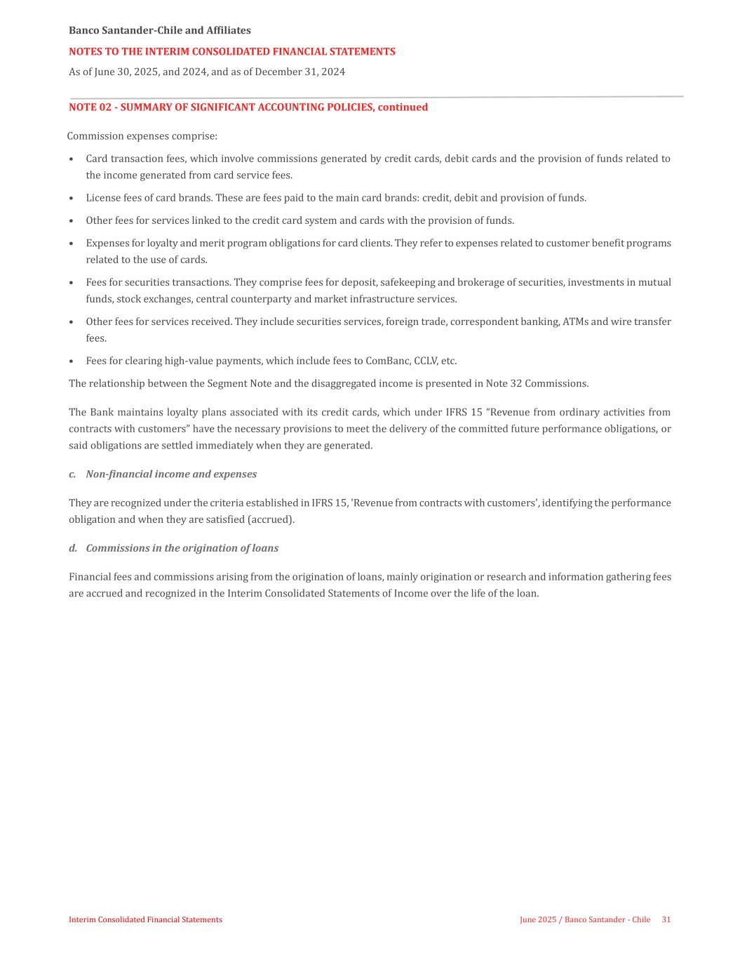Banco Santander-Chile and Affiliates NOTES TO THE INTERIM CONSOLIDATED FINANCIAL STATEMENTS As of June 30, 2025, and 2024, and as of December 31, 2024 Interim Consolidated Financial Statements June 2025 / Banco Santander - Chile 31 NOTE 02 - SUMMARY OF SIGNIFICANT ACCOUNTING POLICIES, continued Commission expenses comprise: Card transaction fees, which involve commissions generated by credit cards, debit cards and the provision of funds related to the income generated from card service fees. License fees of card brands. These are fees paid to the main card brands: credit, debit and provision of funds. Other fees for services linked to the credit card system and cards with the provision of funds. Expenses for loyalty and merit program obligations for card clients. They refer to expenses related to customer benefit programs related to the use of cards. Fees for securities transactions. They comprise fees for deposit, safekeeping and brokerage of securities, investments in mutual funds, stock exchanges, central counterparty and market infrastructure services. Other fees for services received. They include securities services, foreign trade, correspondent banking, ATMs and wire transfer fees. Fees for clearing high-value payments, which include fees to ComBanc, CCLV, etc. The relationship between the Segment Note and the disaggregated income is presented in Note 32 Commissions. or said obligations are settled immediately when they are generated. c. Non-financial income and expenses They are recognized under the criteria established in IFRS 15, 'Revenue from contracts with customers', identifying the performance obligation and when they are satisfied (accrued). d. Commissions in the origination of loans Financial fees and commissions arising from the origination of loans, mainly origination or research and information gathering fees are accrued and recognized in the Interim Consolidated Statements of Income over the life of the loan.