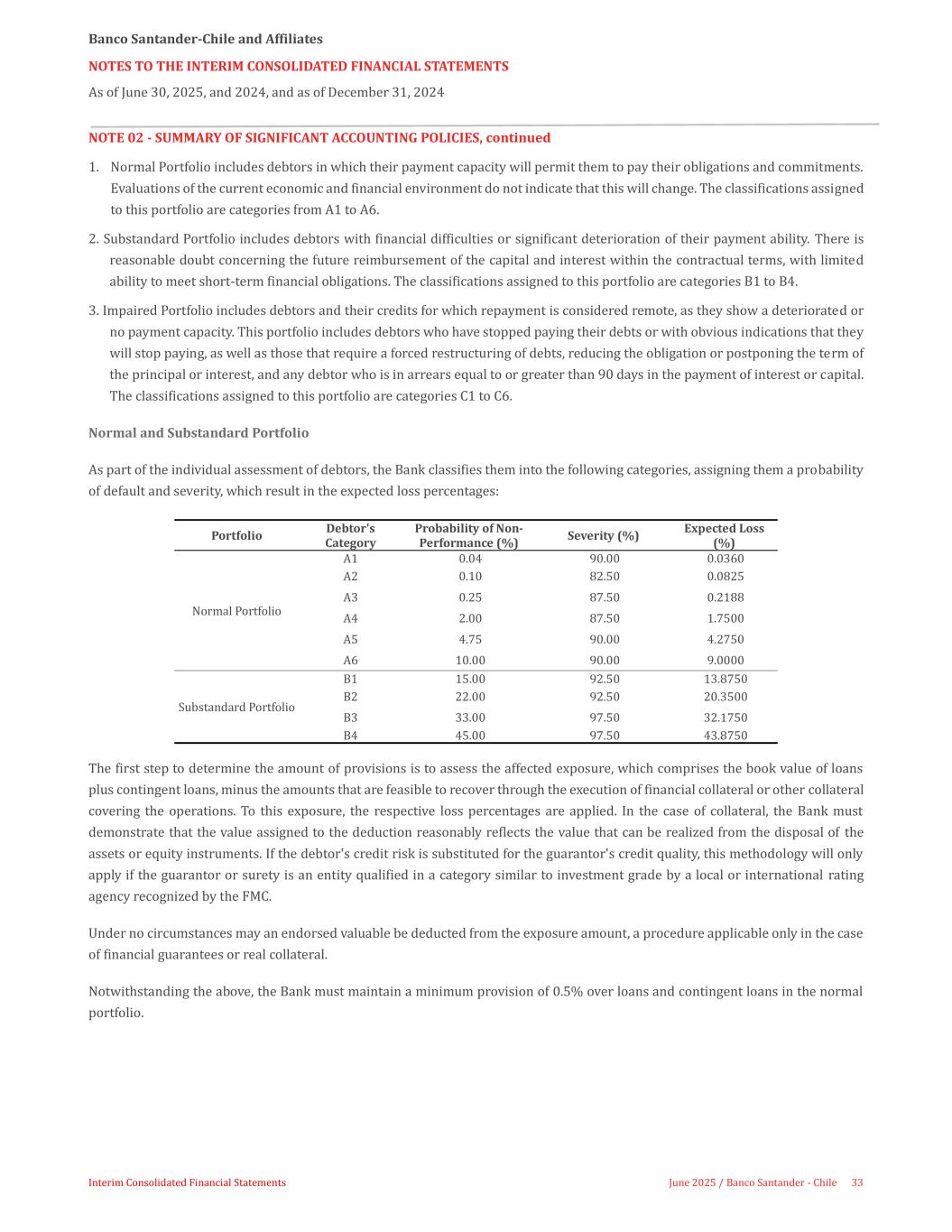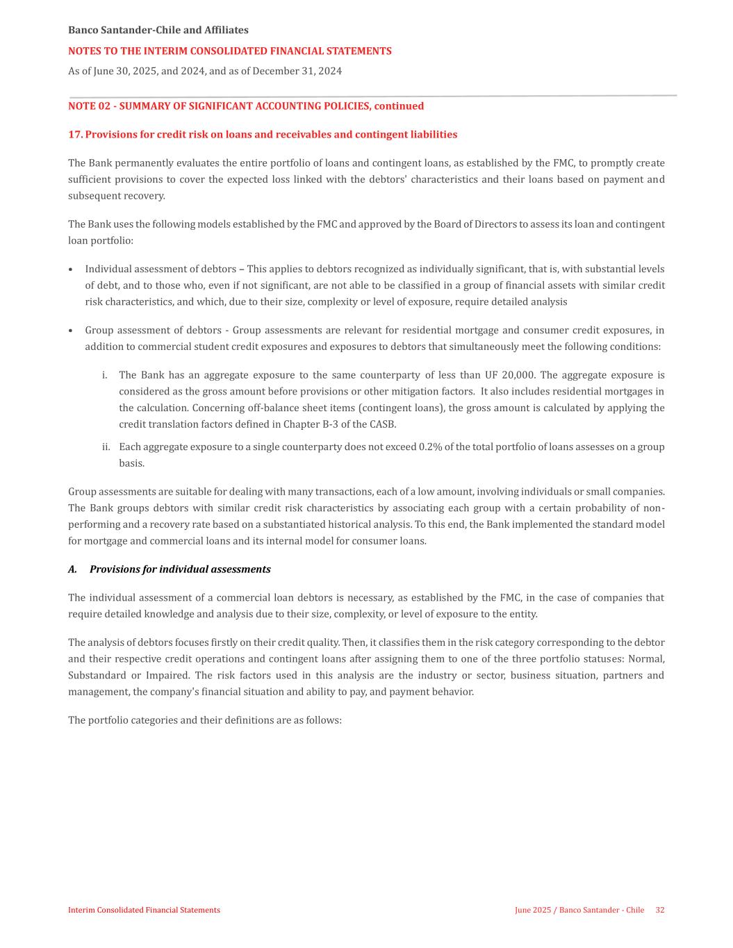 Banco Santander-Chile and Affiliates NOTES TO THE INTERIM CONSOLIDATED FINANCIAL STATEMENTS As of June 30, 2025, and 2024, and as of December 31, 2024 Interim Consolidated Financial Statements June 2025 / Banco Santander - Chile 32 NOTE 02 - SUMMARY OF SIGNIFICANT ACCOUNTING POLICIES, continued 17. Provisions for credit risk on loans and receivables and contingent liabilities The Bank permanently evaluates the entire portfolio of loans and contingent loans, as established by the FMC, to promptly create sufficient provisions to cover the expected loss linked with the debtors' characteristics and their loans based on payment and subsequent recovery. The Bank uses the following models established by the FMC and approved by the Board of Directors to assess its loan and contingent loan portfolio: Individual assessment of debtors This applies to debtors recognized as individually significant, that is, with substantial levels of debt, and to those who, even if not significant, are not able to be classified in a group of financial assets with similar credit risk characteristics, and which, due to their size, complexity or level of exposure, require detailed analysis Group assessment of debtors - Group assessments are relevant for residential mortgage and consumer credit exposures, in addition to commercial student credit exposures and exposures to debtors that simultaneously meet the following conditions: i. The Bank has an aggregate exposure to the same counterparty of less than UF 20,000. The aggregate exposure is considered as the gross amount before provisions or other mitigation factors. It also includes residential mortgages in the calculation. Concerning off-balance sheet items (contingent loans), the gross amount is calculated by applying the credit translation factors defined in Chapter B-3 of the CASB. ii. Each aggregate exposure to a single counterparty does not exceed 0.2% of the total portfolio of loans assesses on a group basis. Group assessments are suitable for dealing with many transactions, each of a low amount, involving individuals or small companies. The Bank groups debtors with similar credit risk characteristics by associating each group with a certain probability of non- performing and a recovery rate based on a substantiated historical analysis. To this end, the Bank implemented the standard model for mortgage and commercial loans and its internal model for consumer loans. A. Provisions for individual assessments The individual assessment of a commercial loan debtors is necessary, as established by the FMC, in the case of companies that require detailed knowledge and analysis due to their size, complexity, or level of exposure to the entity. The analysis of debtors focuses firstly on their credit quality. Then, it classifies them in the risk category corresponding to the debtor and their respective credit operations and contingent loans after assigning them to one of the three portfolio statuses: Normal, Substandard or Impaired. The risk factors used in this analysis are the industry or sector, business situation, partners and management, the company's financial situation and ability to pay, and payment behavior. The portfolio categories and their definitions are as follows: