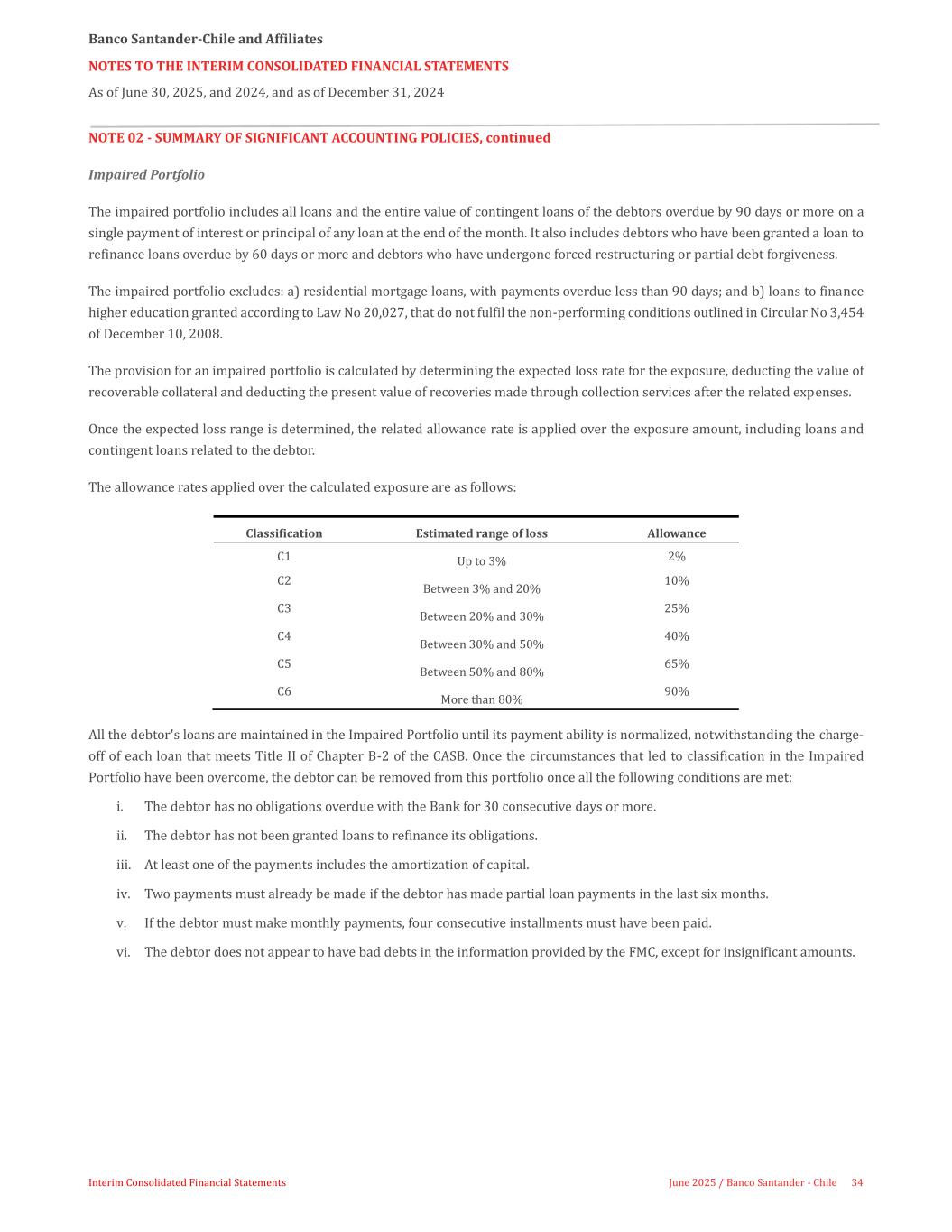 Banco Santander-Chile and Affiliates NOTES TO THE INTERIM CONSOLIDATED FINANCIAL STATEMENTS As of June 30, 2025, and 2024, and as of December 31, 2024 Interim Consolidated Financial Statements June 2025 / Banco Santander - Chile 34 NOTE 02 - SUMMARY OF SIGNIFICANT ACCOUNTING POLICIES, continued Impaired Portfolio The impaired portfolio includes all loans and the entire value of contingent loans of the debtors overdue by 90 days or more on a single payment of interest or principal of any loan at the end of the month. It also includes debtors who have been granted a loan to refinance loans overdue by 60 days or more and debtors who have undergone forced restructuring or partial debt forgiveness. The impaired portfolio excludes: a) residential mortgage loans, with payments overdue less than 90 days; and b) loans to finance higher education granted according to Law No 20,027, that do not fulfil the non-performing conditions outlined in Circular No 3,454 of December 10, 2008. The provision for an impaired portfolio is calculated by determining the expected loss rate for the exposure, deducting the value of recoverable collateral and deducting the present value of recoveries made through collection services after the related expenses. Once the expected loss range is determined, the related allowance rate is applied over the exposure amount, including loans and contingent loans related to the debtor. The allowance rates applied over the calculated exposure are as follows: Classification Estimated range of loss Allowance C1 Up to 3% 2% C2 Between 3% and 20% 10% C3 Between 20% and 30% 25% C4 Between 30% and 50% 40% C5 Between 50% and 80% 65% C6 More than 80% 90% All the debtor's loans are maintained in the Impaired Portfolio until its payment ability is normalized, notwithstanding the charge- off of each loan that meets Title II of Chapter B-2 of the CASB. Once the circumstances that led to classification in the Impaired Portfolio have been overcome, the debtor can be removed from this portfolio once all the following conditions are met: i. The debtor has no obligations overdue with the Bank for 30 consecutive days or more. ii. The debtor has not been granted loans to refinance its obligations. iii. At least one of the payments includes the amortization of capital. iv. Two payments must already be made if the debtor has made partial loan payments in the last six months. v. If the debtor must make monthly payments, four consecutive installments must have been paid. vi. The debtor does not appear to have bad debts in the information provided by the FMC, except for insignificant amounts.