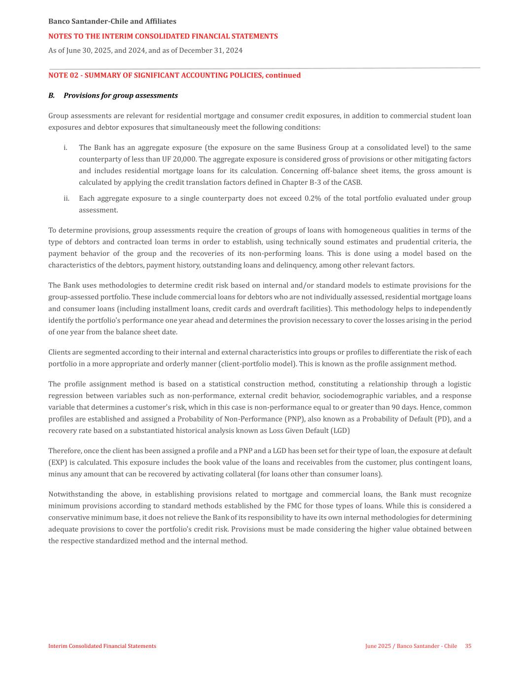 Banco Santander-Chile and Affiliates NOTES TO THE INTERIM CONSOLIDATED FINANCIAL STATEMENTS As of June 30, 2025, and 2024, and as of December 31, 2024 Interim Consolidated Financial Statements June 2025 / Banco Santander - Chile 35 NOTE 02 - SUMMARY OF SIGNIFICANT ACCOUNTING POLICIES, continued B. Provisions for group assessments Group assessments are relevant for residential mortgage and consumer credit exposures, in addition to commercial student loan exposures and debtor exposures that simultaneously meet the following conditions: i. The Bank has an aggregate exposure (the exposure on the same Business Group at a consolidated level) to the same counterparty of less than UF 20,000. The aggregate exposure is considered gross of provisions or other mitigating factors and includes residential mortgage loans for its calculation. Concerning off-balance sheet items, the gross amount is calculated by applying the credit translation factors defined in Chapter B-3 of the CASB. ii. Each aggregate exposure to a single counterparty does not exceed 0.2% of the total portfolio evaluated under group assessment. To determine provisions, group assessments require the creation of groups of loans with homogeneous qualities in terms of the type of debtors and contracted loan terms in order to establish, using technically sound estimates and prudential criteria, the payment behavior of the group and the recoveries of its non-performing loans. This is done using a model based on the characteristics of the debtors, payment history, outstanding loans and delinquency, among other relevant factors. The Bank uses methodologies to determine credit risk based on internal and/or standard models to estimate provisions for the group-assessed portfolio. These include commercial loans for debtors who are not individually assessed, residential mortgage loans and consumer loans (including installment loans, credit cards and overdraft facilities). This methodology helps to independently identify the portfolio's performance one year ahead and determines the provision necessary to cover the losses arising in the period of one year from the balance sheet date. Clients are segmented according to their internal and external characteristics into groups or profiles to differentiate the risk of each portfolio in a more appropriate and orderly manner (client-portfolio model). This is known as the profile assignment method. The profile assignment method is based on a statistical construction method, constituting a relationship through a logistic regression between variables such as non-performance, external credit behavior, sociodemographic variables, and a response variable that determines a customer's risk, which in this case is non-performance equal to or greater than 90 days. Hence, common profiles are established and assigned a Probability of Non-Performance (PNP), also known as a Probability of Default (PD), and a recovery rate based on a substantiated historical analysis known as Loss Given Default (LGD) Therefore, once the client has been assigned a profile and a PNP and a LGD has been set for their type of loan, the exposure at default (EXP) is calculated. This exposure includes the book value of the loans and receivables from the customer, plus contingent loans, minus any amount that can be recovered by activating collateral (for loans other than consumer loans). Notwithstanding the above, in establishing provisions related to mortgage and commercial loans, the Bank must recognize minimum provisions according to standard methods established by the FMC for those types of loans. While this is considered a conservative minimum base, it does not relieve the Bank of its responsibility to have its own internal methodologies for determining adequate provisions to cover the portfolio's credit risk. Provisions must be made considering the higher value obtained between the respective standardized method and the internal method.