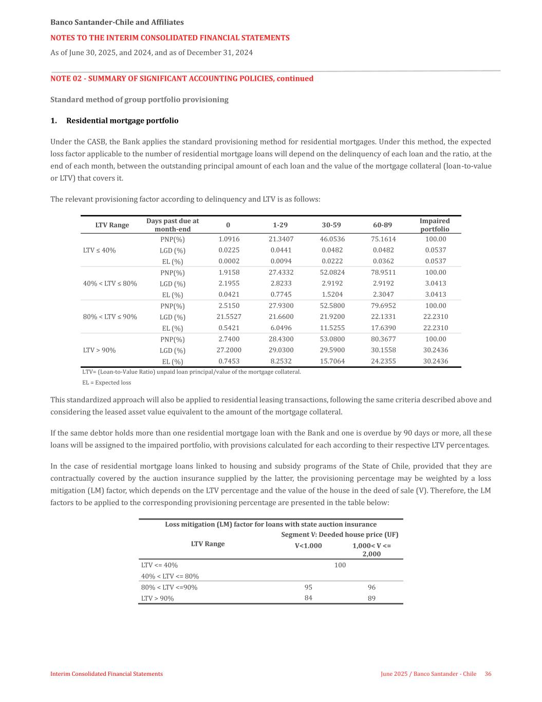 Banco Santander-Chile and Affiliates NOTES TO THE INTERIM CONSOLIDATED FINANCIAL STATEMENTS As of June 30, 2025, and 2024, and as of December 31, 2024 Interim Consolidated Financial Statements June 2025 / Banco Santander - Chile 36 NOTE 02 - SUMMARY OF SIGNIFICANT ACCOUNTING POLICIES, continued Standard method of group portfolio provisioning 1. Residential mortgage portfolio Under the CASB, the Bank applies the standard provisioning method for residential mortgages. Under this method, the expected loss factor applicable to the number of residential mortgage loans will depend on the delinquency of each loan and the ratio, at the end of each month, between the outstanding principal amount of each loan and the value of the mortgage collateral (loan-to-value or LTV) that covers it. The relevant provisioning factor according to delinquency and LTV is as follows: LTV Range Days past due at month-end 0 1-29 30-59 60-89 Impaired portfolio PNP(%) 1.0916 21.3407 46.0536 75.1614 100.00 LGD (%) 0.0225 0.0441 0.0482 0.0482 0.0537 EL (%) 0.0002 0.0094 0.0222 0.0362 0.0537 PNP(%) 1.9158 27.4332 52.0824 78.9511 100.00 LGD (%) 2.1955 2.8233 2.9192 2.9192 3.0413 EL (%) 0.0421 0.7745 1.5204 2.3047 3.0413 PNP(%) 2.5150 27.9300 52.5800 79.6952 100.00 LGD (%) 21.5527 21.6600 21.9200 22.1331 22.2310 EL (%) 0.5421 6.0496 11.5255 17.6390 22.2310 LTV > 90% PNP(%) 2.7400 28.4300 53.0800 80.3677 100.00 LGD (%) 27.2000 29.0300 29.5900 30.1558 30.2436 EL (%) 0.7453 8.2532 15.7064 24.2355 30.2436 LTV= (Loan-to-Value Ratio) unpaid loan principal/value of the mortgage collateral. EL = Expected loss This standardized approach will also be applied to residential leasing transactions, following the same criteria described above and considering the leased asset value equivalent to the amount of the mortgage collateral. If the same debtor holds more than one residential mortgage loan with the Bank and one is overdue by 90 days or more, all these loans will be assigned to the impaired portfolio, with provisions calculated for each according to their respective LTV percentages. In the case of residential mortgage loans linked to housing and subsidy programs of the State of Chile, provided that they are contractually covered by the auction insurance supplied by the latter, the provisioning percentage may be weighted by a loss mitigation (LM) factor, which depends on the LTV percentage and the value of the house in the deed of sale (V). Therefore, the LM factors to be applied to the corresponding provisioning percentage are presented in the table below: Loss mitigation (LM) factor for loans with state auction insurance LTV Range Segment V: Deeded house price (UF) V<1.000 1,000< V <= 2,000 LTV <= 40% 100 40% < LTV <= 80% 80% < LTV <=90% 95 96 LTV > 90% 84 89