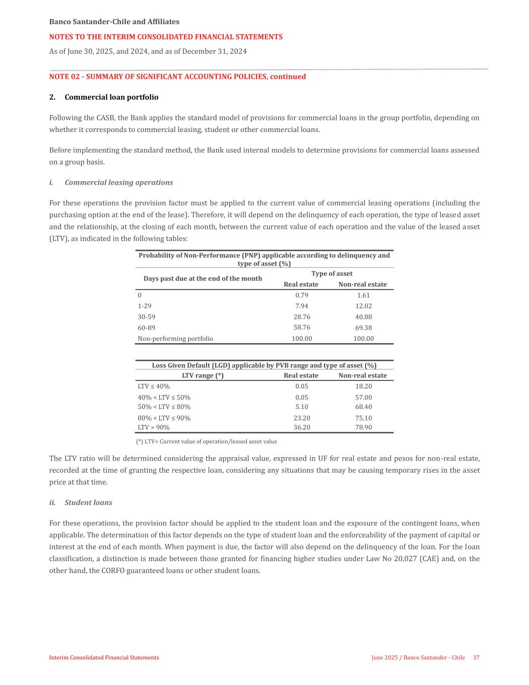 Banco Santander-Chile and Affiliates NOTES TO THE INTERIM CONSOLIDATED FINANCIAL STATEMENTS As of June 30, 2025, and 2024, and as of December 31, 2024 Interim Consolidated Financial Statements June 2025 / Banco Santander - Chile 37 NOTE 02 - SUMMARY OF SIGNIFICANT ACCOUNTING POLICIES, continued 2. Commercial loan portfolio Following the CASB, the Bank applies the standard model of provisions for commercial loans in the group portfolio, depending on whether it corresponds to commercial leasing, student or other commercial loans. Before implementing the standard method, the Bank used internal models to determine provisions for commercial loans assessed on a group basis. i. Commercial leasing operations For these operations the provision factor must be applied to the current value of commercial leasing operations (including the purchasing option at the end of the lease). Therefore, it will depend on the delinquency of each operation, the type of leased asset and the relationship, at the closing of each month, between the current value of each operation and the value of the leased asset (LTV), as indicated in the following tables: Probability of Non-Performance (PNP) applicable according to delinquency and type of asset (%) Days past due at the end of the month Type of asset Real estate Non-real estate 0 0.79 1.61 1-29 7.94 12.02 30-59 28.76 40.88 60-89 58.76 69.38 Non-performing portfolio 100.00 100.00 Loss Given Default (LGD) applicable by PVB range and type of asset (%) LTV range (*) Real estate Non-real estate 0.05 18.20 0.05 57.00 5.10 68.40 23.20 75.10 LTV > 90% 36.20 78.90 (*) LTV= Current value of operation/leased asset value The LTV ratio will be determined considering the appraisal value, expressed in UF for real estate and pesos for non-real estate, recorded at the time of granting the respective loan, considering any situations that may be causing temporary rises in the asset price at that time. ii. Student loans For these operations, the provision factor should be applied to the student loan and the exposure of the contingent loans, when applicable. The determination of this factor depends on the type of student loan and the enforceability of the payment of capital or interest at the end of each month. When payment is due, the factor will also depend on the delinquency of the loan. For the loan classification, a distinction is made between those granted for financing higher studies under Law No 20,027 (CAE) and, on the other hand, the CORFO guaranteed loans or other student loans.