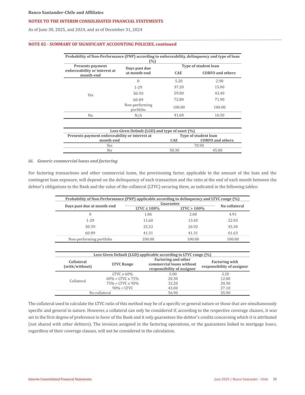 Banco Santander-Chile and Affiliates NOTES TO THE INTERIM CONSOLIDATED FINANCIAL STATEMENTS As of June 30, 2025, and 2024, and as of December 31, 2024 Interim Consolidated Financial Statements June 2025 / Banco Santander - Chile 38 NOTE 02 - SUMMARY OF SIGNIFICANT ACCOUNTING POLICIES, continued Probability of Non-Performance (PNP) according to enforceability, delinquency and type of loan (%) Presents payment enforceability or interest at month-end Days past due at month-end Type of student loan CAE CORFO and others Yes 0 5.20 2.90 1-29 37.20 15.00 30-59 59.00 43.40 60-89 72.80 71.90 Non-performing portfolio 100.00 100.00 No N/A 41.60 16.50 Loss Given Default (LGD) and type of asset (%) Presents payment enforceability or interest at month-end Type of student loan CAE CORFO and others Yes 70.90 No 50.30 45.80 iii. Generic commercial loans and factoring For factoring transactions and other commercial loans, the provisioning factor, applicable to the amount of the loan and the contingent loan exposure, will depend on the delinquency of each transaction and the ratio at the end of each month between the debtor's obligations to the Bank and the value of the collateral (LTVC) securing them, as indicated in the following tables: Probability of Non-Performance (PNP) applicable according to delinquency and LTVC range (%) Days past due at month-end Guarantee No collateral LTVC > 100% 0 1.86 2.68 4.91 1-29 11.60 13.45 22.93 30-59 25.33 26.92 45.30 60-89 41.31 41.31 61.63 Non-performing portfolio 100.00 100.00 100.00 Loss Given Default (LGD) applicable according to LTVC range (%) Collateral (with/without) LTVC Range Factoring and other commercial loans without responsibility of assignor Factoring with responsibility of assignor Collateral 5.00 3.20 20.30 12.80 32.20 20.30 90% < LTVC 43.00 27.10 No collateral 56.90 35.90 The collateral used to calculate the LTVC ratio of this method may be of a specific or general nature or those that are simultaneously specific and general in nature. However, a collateral can only be considered if, according to the respective coverage clauses, it was set in the first degree of preference in favor of the Bank and it only guarantees the debtor's credits concerning which it is attributed (not shared with other debtors). The invoices assigned in the factoring operations, or the guarantees linked to mortgage loans, regardless of their coverage clauses, will not be considered in the calculation.
