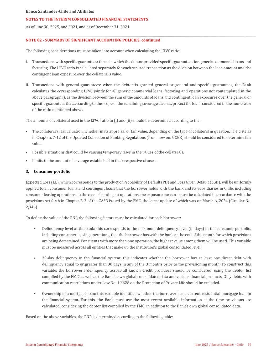Banco Santander-Chile and Affiliates NOTES TO THE INTERIM CONSOLIDATED FINANCIAL STATEMENTS As of June 30, 2025, and 2024, and as of December 31, 2024 Interim Consolidated Financial Statements June 2025 / Banco Santander - Chile 39 NOTE 02 - SUMMARY OF SIGNIFICANT ACCOUNTING POLICIES, continued The following considerations must be taken into account when calculating the LTVC ratio: i. Transactions with specific guarantees: those in which the debtor provided specific guarantees for generic commercial loans and factoring. The LTVC ratio is calculated separately for each secured transaction as the division between the loan amount and the contingent loan exposure over the collateral's value. ii. Transactions with general guarantees: when the debtor is granted general or general and specific guarantees, the Bank calculates the corresponding LTVC jointly for all generic commercial loans, factoring and operations not contemplated in the above paragraph i), as the division between the sum of the amounts of loans and contingent loan exposures over the general or specific guarantees that, according to the scope of the remaining coverage clauses, protect the loans considered in the numerator of the ratio mentioned above. The amounts of collateral used in the LTVC ratio in (i) and (ii) should be determined according to the: criteria in Chapters 7-12 of the Updated Collection of Banking Regulations (from now on: UCBR) should be considered to determine fair value. Possible situations that could be causing temporary rises in the values of the collaterals. Limits to the amount of coverage established in their respective clauses. 3. Consumer portfolio Expected Loss (EL), which corresponds to the product of Probability of Default (PD) and Loss Given Default (LGD), will be uniformly applied to all consumer loans and contingent loans that the borrower holds with the bank and its subsidiaries in Chile, including consumer leasing operations. In the case of contingent operations, the exposure measure must be calculated in accordance with the provisions set forth in Chapter B-3 of the CASB issued by the FMC, the latest update of which was on March 6, 2024 (Circular No. 2,346). To define the value of the PNP, the following factors must be calculated for each borrower: Delinquency level at the bank: this corresponds to the maximum delinquency level (in days) in the consumer portfolio, including consumer leasing operations, that the borrower has with the bank at the end of the month for which provisions are being determined. For clients with more than one operation, the highest value among them will be used. This variable 30-day delinquency in the financial system: this indicates whether the borrower has at least one direct debt with delinquency equal to or greater than 30 days in any of the 3 months prior to the provisioning month. To construct this variable, the borrower's delinquency across all known credit providers should be considered, using the debtor list communication restrictions under Law No. 19.628 on the Protection of Private Life should be excluded. Ownership of a mortgage loan: this variable identifies whether the borrower has a current residential mortgage loan in the financial system. For this, the Bank must use the most recent available information at the time provisions are calculated, considerin Based on the above variables, the PNP is determined according to the following table: