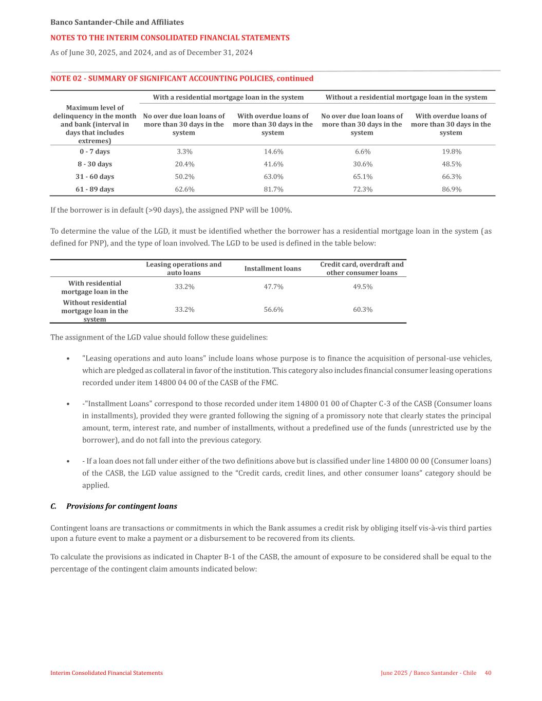 Banco Santander-Chile and Affiliates NOTES TO THE INTERIM CONSOLIDATED FINANCIAL STATEMENTS As of June 30, 2025, and 2024, and as of December 31, 2024 Interim Consolidated Financial Statements June 2025 / Banco Santander - Chile 40 NOTE 02 - SUMMARY OF SIGNIFICANT ACCOUNTING POLICIES, continued With a residential mortgage loan in the system Without a residential mortgage loan in the system Maximum level of delinquency in the month and bank (interval in days that includes extremes) No over due loan loans of more than 30 days in the system With overdue loans of more than 30 days in the system No over due loan loans of more than 30 days in the system With overdue loans of more than 30 days in the system 0 - 7 days 3.3% 14.6% 6.6% 19.8% 8 - 30 days 20.4% 41.6% 30.6% 48.5% 31 - 60 days 50.2% 63.0% 65.1% 66.3% 61 - 89 days 62.6% 81.7% 72.3% 86.9% If the borrower is in default (>90 days), the assigned PNP will be 100%. To determine the value of the LGD, it must be identified whether the borrower has a residential mortgage loan in the system (as defined for PNP), and the type of loan involved. The LGD to be used is defined in the table below: Leasing operations and auto loans Installment loans Credit card, overdraft and other consumer loans With residential mortgage loan in the 33.2% 47.7% 49.5% Without residential mortgage loan in the system 33.2% 56.6% 60.3% The assignment of the LGD value should follow these guidelines: "Leasing operations and auto loans" include loans whose purpose is to finance the acquisition of personal-use vehicles, which are pledged as collateral in favor of the institution. This category also includes financial consumer leasing operations recorded under item 14800 04 00 of the CASB of the FMC. -"Installment Loans" correspond to those recorded under item 14800 01 00 of Chapter C-3 of the CASB (Consumer loans in installments), provided they were granted following the signing of a promissory note that clearly states the principal amount, term, interest rate, and number of installments, without a predefined use of the funds (unrestricted use by the borrower), and do not fall into the previous category. - If a loan does not fall under either of the two definitions above but is classified under line 14800 00 00 (Consumer loans) applied. C. Provisions for contingent loans Contingent loans are transactions or commitments in which the Bank assumes a credit risk by obliging itself vis-à-vis third parties upon a future event to make a payment or a disbursement to be recovered from its clients. To calculate the provisions as indicated in Chapter B-1 of the CASB, the amount of exposure to be considered shall be equal to the percentage of the contingent claim amounts indicated below: