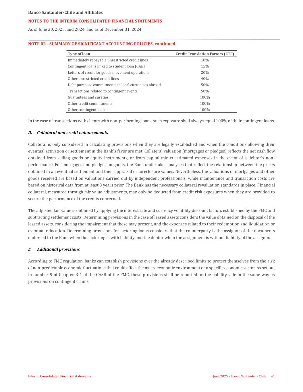 Banco Santander-Chile and Affiliates NOTES TO THE INTERIM CONSOLIDATED FINANCIAL STATEMENTS As of June 30, 2025, and 2024, and as of December 31, 2024 Interim Consolidated Financial Statements June 2025 / Banco Santander - Chile 41 NOTE 02 - SUMMARY OF SIGNIFICANT ACCOUNTING POLICIES, continued Type of loan Credit Translation Factors (CTF) Immediately repayable unrestricted credit lines 10% Contingent loans linked to student loan (CAE) 15% Letters of credit for goods movement operations 20% Other unrestricted credit lines 40% Debt purchase commitments in local currencies abroad 50% Transactions related to contingent events 50% Guarantees and sureties 100% Other credit commitments 100% Other contingent loans 100% In the case of transactions with clients with non-performing loans, such exposure shall always equal 100% of their contingent loans. D. Collateral and credit enhancements Collateral is only considered in calculating provisions when they are legally established and when the conditions allowing their eventual activation or settlement in the Bank's favor are met. Collateral valuation (mortgages or pledges) reflects the net cash flow obtained from selling goods or equity instruments, or from capital minus estimated expenses in the event of a debtor's non- performance. For mortgages and pledges on goods, the Bank undertakes analyses that reflect the relationship between the prices obtained in an eventual settlement and their appraisal or foreclosure values. Nevertheless, the valuations of mortgages and other goods received are based on valuations carried out by independent professionals, while maintenance and transaction costs are based on historical data from at least 3 years prior. The Bank has the necessary collateral revaluation standards in place. Financial collateral, measured through fair value adjustments, may only be deducted from credit risk exposures when they are provided to secure the performance of the credits concerned. The adjusted fair value is obtained by applying the interest rate and currency volatility discount factors established by the FMC and subtracting settlement costs. Determining provisions in the case of leased assets considers the value obtained on the disposal of the leased assets, considering the impairment that these may present, and the expenses related to their redemption and liquidation or eventual relocation. Determining provisions for factoring loans considers that the counterparty is the assignor of the documents endorsed to the Bank when the factoring is with liability and the debtor when the assignment is without liability of the assignor. E. Additional provisions According to FMC regulation, banks can establish provisions over the already described limits to protect themselves from the risk of non-predictable economic fluctuations that could affect the macroeconomic environment or a specific economic sector. As set out in number 9 of Chapter B-1 of the CASB of the FMC, these provisions shall be reported on the liability side in the same way as provisions on contingent claims.