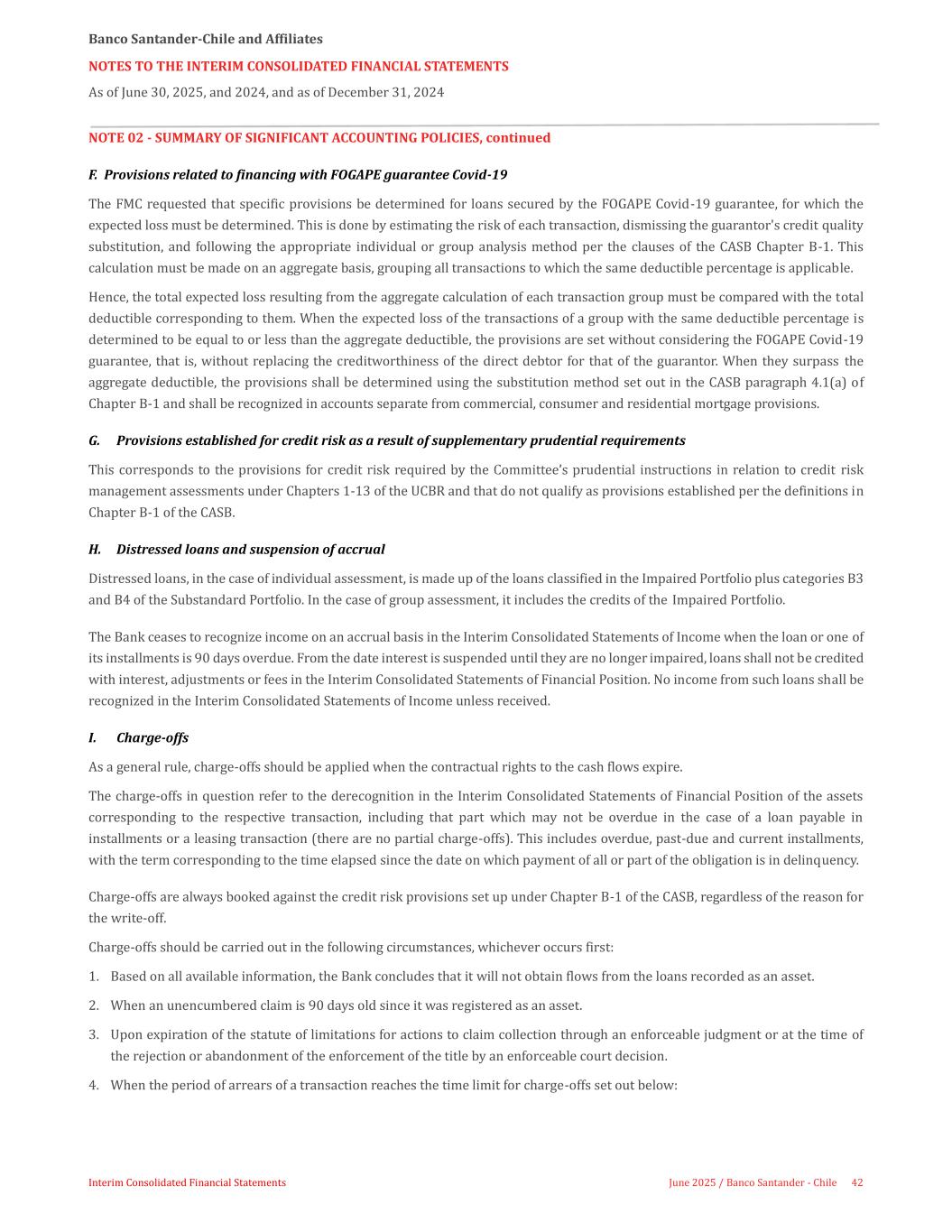 Banco Santander-Chile and Affiliates NOTES TO THE INTERIM CONSOLIDATED FINANCIAL STATEMENTS As of June 30, 2025, and 2024, and as of December 31, 2024 Interim Consolidated Financial Statements June 2025 / Banco Santander - Chile 42 NOTE 02 - SUMMARY OF SIGNIFICANT ACCOUNTING POLICIES, continued F. Provisions related to financing with FOGAPE guarantee Covid-19 The FMC requested that specific provisions be determined for loans secured by the FOGAPE Covid-19 guarantee, for which the expected loss must be determined. This is done by estimating the risk of each transaction, dismissing the guarantor's credit quality substitution, and following the appropriate individual or group analysis method per the clauses of the CASB Chapter B-1. This calculation must be made on an aggregate basis, grouping all transactions to which the same deductible percentage is applicable. Hence, the total expected loss resulting from the aggregate calculation of each transaction group must be compared with the total deductible corresponding to them. When the expected loss of the transactions of a group with the same deductible percentage is determined to be equal to or less than the aggregate deductible, the provisions are set without considering the FOGAPE Covid-19 guarantee, that is, without replacing the creditworthiness of the direct debtor for that of the guarantor. When they surpass the aggregate deductible, the provisions shall be determined using the substitution method set out in the CASB paragraph 4.1(a) of Chapter B-1 and shall be recognized in accounts separate from commercial, consumer and residential mortgage provisions. G. Provisions established for credit risk as a result of supplementary prudential requirements risk management assessments under Chapters 1-13 of the UCBR and that do not qualify as provisions established per the definitions in Chapter B-1 of the CASB. H. Distressed loans and suspension of accrual Distressed loans, in the case of individual assessment, is made up of the loans classified in the Impaired Portfolio plus categories B3 and B4 of the Substandard Portfolio. In the case of group assessment, it includes the credits of the Impaired Portfolio. The Bank ceases to recognize income on an accrual basis in the Interim Consolidated Statements of Income when the loan or one of its installments is 90 days overdue. From the date interest is suspended until they are no longer impaired, loans shall not be credited with interest, adjustments or fees in the Interim Consolidated Statements of Financial Position. No income from such loans shall be recognized in the Interim Consolidated Statements of Income unless received. I. Charge-offs As a general rule, charge-offs should be applied when the contractual rights to the cash flows expire. The charge-offs in question refer to the derecognition in the Interim Consolidated Statements of Financial Position of the assets corresponding to the respective transaction, including that part which may not be overdue in the case of a loan payable in installments or a leasing transaction (there are no partial charge-offs). This includes overdue, past-due and current installments, with the term corresponding to the time elapsed since the date on which payment of all or part of the obligation is in delinquency. Charge-offs are always booked against the credit risk provisions set up under Chapter B-1 of the CASB, regardless of the reason for the write-off. Charge-offs should be carried out in the following circumstances, whichever occurs first: 1. Based on all available information, the Bank concludes that it will not obtain flows from the loans recorded as an asset. 2. When an unencumbered claim is 90 days old since it was registered as an asset. 3. Upon expiration of the statute of limitations for actions to claim collection through an enforceable judgment or at the time of the rejection or abandonment of the enforcement of the title by an enforceable court decision. 4. When the period of arrears of a transaction reaches the time limit for charge-offs set out below: