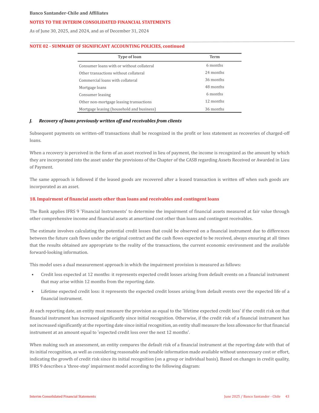 Banco Santander-Chile and Affiliates NOTES TO THE INTERIM CONSOLIDATED FINANCIAL STATEMENTS As of June 30, 2025, and 2024, and as of December 31, 2024 Interim Consolidated Financial Statements June 2025 / Banco Santander - Chile 43 NOTE 02 - SUMMARY OF SIGNIFICANT ACCOUNTING POLICIES, continued Type of loan Term Consumer loans with or without collateral 6 months Other transactions without collateral 24 months Commercial loans with collateral 36 months Mortgage loans 48 months Consumer leasing 6 months Other non-mortgage leasing transactions 12 months Mortgage leasing (household and business) 36 months J. Recovery of loans previously written off and receivables from clients Subsequent payments on written-off transactions shall be recognized in the profit or loss statement as recoveries of charged-off loans. When a recovery is perceived in the form of an asset received in lieu of payment, the income is recognized as the amount by which they are incorporated into the asset under the provisions of the Chapter of the CASB regarding Assets Received or Awarded in Lieu of Payment. The same approach is followed if the leased goods are recovered after a leased transaction is written off when such goods are incorporated as an asset. 18. Impairment of financial assets other than loans and receivables and contingent loans The Bank applies IFRS 9 'Financial Instruments' to determine the impairment of financial assets measured at fair value through other comprehensive income and financial assets at amortized cost other than loans and contingent receivables. The estimate involves calculating the potential credit losses that could be observed on a financial instrument due to differences between the future cash flows under the original contract and the cash flows expected to be received, always ensuring at all times that the results obtained are appropriate to the reality of the transactions, the current economic environment and the available forward-looking information. This model uses a dual measurement approach in which the impairment provision is measured as follows: Credit loss expected at 12 months: it represents expected credit losses arising from default events on a financial instrument that may arise within 12 months from the reporting date. Lifetime expected credit loss: it represents the expected credit losses arising from default events over the expected life of a financial instrument. At each reporting date, an entity must measure the provision as equal to the 'lifetime expected credit loss' if the credit risk on that financial instrument has increased significantly since initial recognition. Otherwise, if the credit risk of a financial instrument has not increased significantly at the reporting date since initial recognition, an entity shall measure the loss allowance for that financial instrument at an amount equal to 'expected credit loss over the next 12 months'. When making such an assessment, an entity compares the default risk of a financial instrument at the reporting date with that of its initial recognition, as well as considering reasonable and tenable information made available without unnecessary cost or effort, indicating the growth of credit risk since its initial recognition (on a group or individual basis). Based on changes in credit quality, IFRS 9 describes a 'three-step' impairment model according to the following diagram: