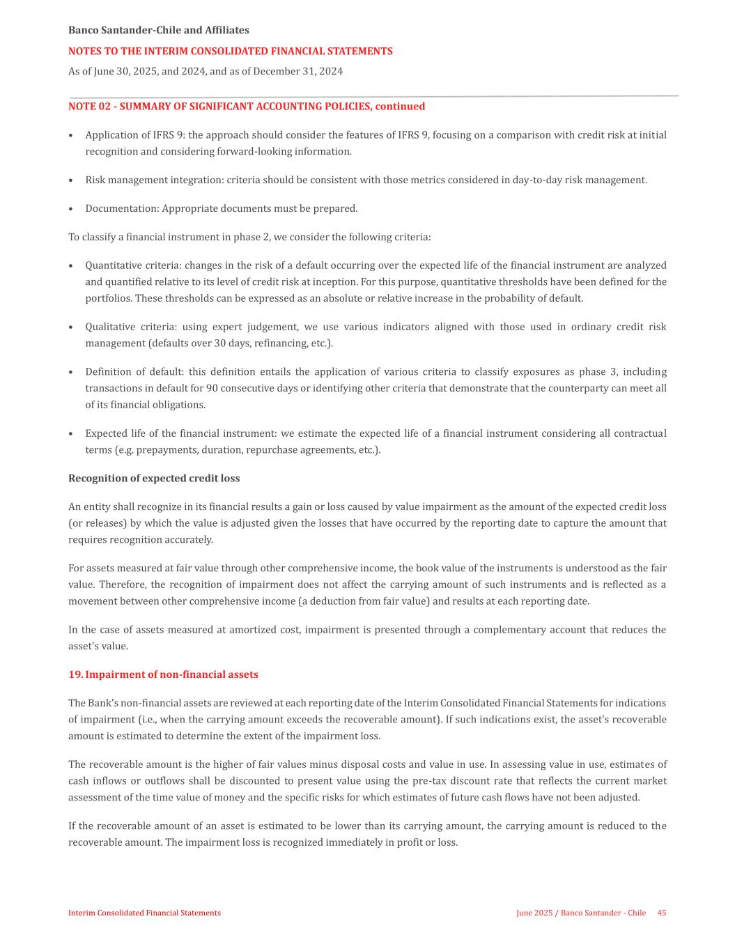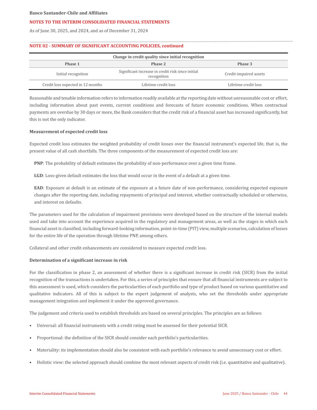 Banco Santander-Chile and Affiliates NOTES TO THE INTERIM CONSOLIDATED FINANCIAL STATEMENTS As of June 30, 2025, and 2024, and as of December 31, 2024 Interim Consolidated Financial Statements June 2025 / Banco Santander - Chile 44 NOTE 02 - SUMMARY OF SIGNIFICANT ACCOUNTING POLICIES, continued Change in credit quality since initial recognition Phase 1 Phase 2 Phase 3 Initial recognition Significant increase in credit risk since initial recognition Credit-impaired assets Credit loss expected in 12 months Lifetime credit loss Lifetime credit loss Reasonable and tenable information refers to information readily available at the reporting date without unreasonable cost or effort, including information about past events, current conditions and forecasts of future economic conditions. When contractual payments are overdue by 30 days or more, the Bank considers that the credit risk of a financial asset has increased significantly, but this is not the only indicator. Measurement of expected credit loss Expected credit loss estimates the weighted probability of credit losses over the financial instrument's expected life, that is, the present value of all cash shortfalls. The three components of the measurement of expected credit loss are: PNP: The probability of default estimates the probability of non-performance over a given time frame. LGD: Loss-given default estimates the loss that would occur in the event of a default at a given time. EAD: Exposure at default is an estimate of the exposure at a future date of non-performance, considering expected exposure changes after the reporting date, including repayments of principal and interest, whether contractually scheduled or otherwise, and interest on defaults. The parameters used for the calculation of impairment provisions were developed based on the structure of the internal models used and take into account the experience acquired in the regulatory and management areas, as well as the stages in which each financial asset is classified, including forward-looking information, point-in-time (PIT) view, multiple scenarios, calculation of losses for the entire life of the operation through lifetime PNP, among others. Collateral and other credit enhancements are considered to measure expected credit loss. Determination of a significant increase in risk For the classification in phase 2, an assessment of whether there is a significant increase in credit risk (SICR) from the initial recognition of the transactions is undertaken. For this, a series of principles that ensure that all financial instruments are subject to this assessment is used, which considers the particularities of each portfolio and type of product based on various quantitative and qualitative indicators. All of this is subject to the expert judgement of analysts, who set the thresholds under appropriate management integration and implement it under the approved governance. The judgement and criteria used to establish thresholds are based on several principles. The principles are as follows: Universal: all financial instruments with a credit rating must be assessed for their potential SICR. Proportional: the definition of the SICR should consider each portfolio's particularities. Materiality: its implementation should also be consistent with each portfolio's relevance to avoid unnecessary cost or effort. Holistic view: the selected approach should combine the most relevant aspects of credit risk (i.e. quantitative and qualitative).