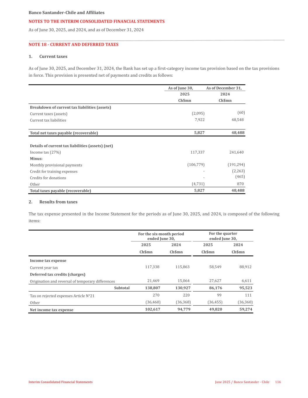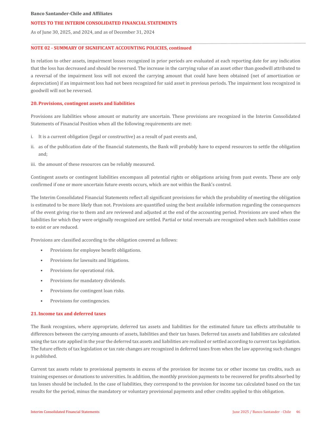 Banco Santander-Chile and Affiliates NOTES TO THE INTERIM CONSOLIDATED FINANCIAL STATEMENTS As of June 30, 2025, and 2024, and as of December 31, 2024 Interim Consolidated Financial Statements June 2025 / Banco Santander - Chile 46 NOTE 02 - SUMMARY OF SIGNIFICANT ACCOUNTING POLICIES, continued In relation to other assets, impairment losses recognized in prior periods are evaluated at each reporting date for any indication that the loss has decreased and should be reversed. The increase in the carrying value of an asset other than goodwill attributed to a reversal of the impairment loss will not exceed the carrying amount that could have been obtained (net of amortization or depreciation) if an impairment loss had not been recognized for said asset in previous periods. The impairment loss recognized in goodwill will not be reversed. 20. Provisions, contingent assets and liabilities Provisions are liabilities whose amount or maturity are uncertain. These provisions are recognized in the Interim Consolidated Statements of Financial Position when all the following requirements are met: i. It is a current obligation (legal or constructive) as a result of past events and, ii. as of the publication date of the financial statements, the Bank will probably have to expend resources to settle the obligation and; iii. the amount of these resources can be reliably measured. Contingent assets or contingent liabilities encompass all potential rights or obligations arising from past events. These are only confirmed if one or more uncertain future events occurs, which are not within the Bank's control. The Interim Consolidated Financial Statements reflect all significant provisions for which the probability of meeting the obligation is estimated to be more likely than not. Provisions are quantified using the best available information regarding the consequences of the event giving rise to them and are reviewed and adjusted at the end of the accounting period. Provisions are used when the liabilities for which they were originally recognized are settled. Partial or total reversals are recognized when such liabilities cease to exist or are reduced. Provisions are classified according to the obligation covered as follows: Provisions for employee benefit obligations. Provisions for lawsuits and litigations. Provisions for operational risk. Provisions for mandatory dividends. Provisions for contingent loan risks. Provisions for contingencies. 21. Income tax and deferred taxes The Bank recognizes, where appropriate, deferred tax assets and liabilities for the estimated future tax effects attributable to differences between the carrying amounts of assets, liabilities and their tax bases. Deferred tax assets and liabilities are calculated using the tax rate applied in the year the deferred tax assets and liabilities are realized or settled according to current tax legislation. The future effects of tax legislation or tax rate changes are recognized in deferred taxes from when the law approving such changes is published. Current tax assets relate to provisional payments in excess of the provision for income tax or other income tax credits, such as training expenses or donations to universities. In addition, the monthly provision payments to be recovered for profits absorbed by tax losses should be included. In the case of liabilities, they correspond to the provision for income tax calculated based on the tax results for the period, minus the mandatory or voluntary provisional payments and other credits applied to this obligation.