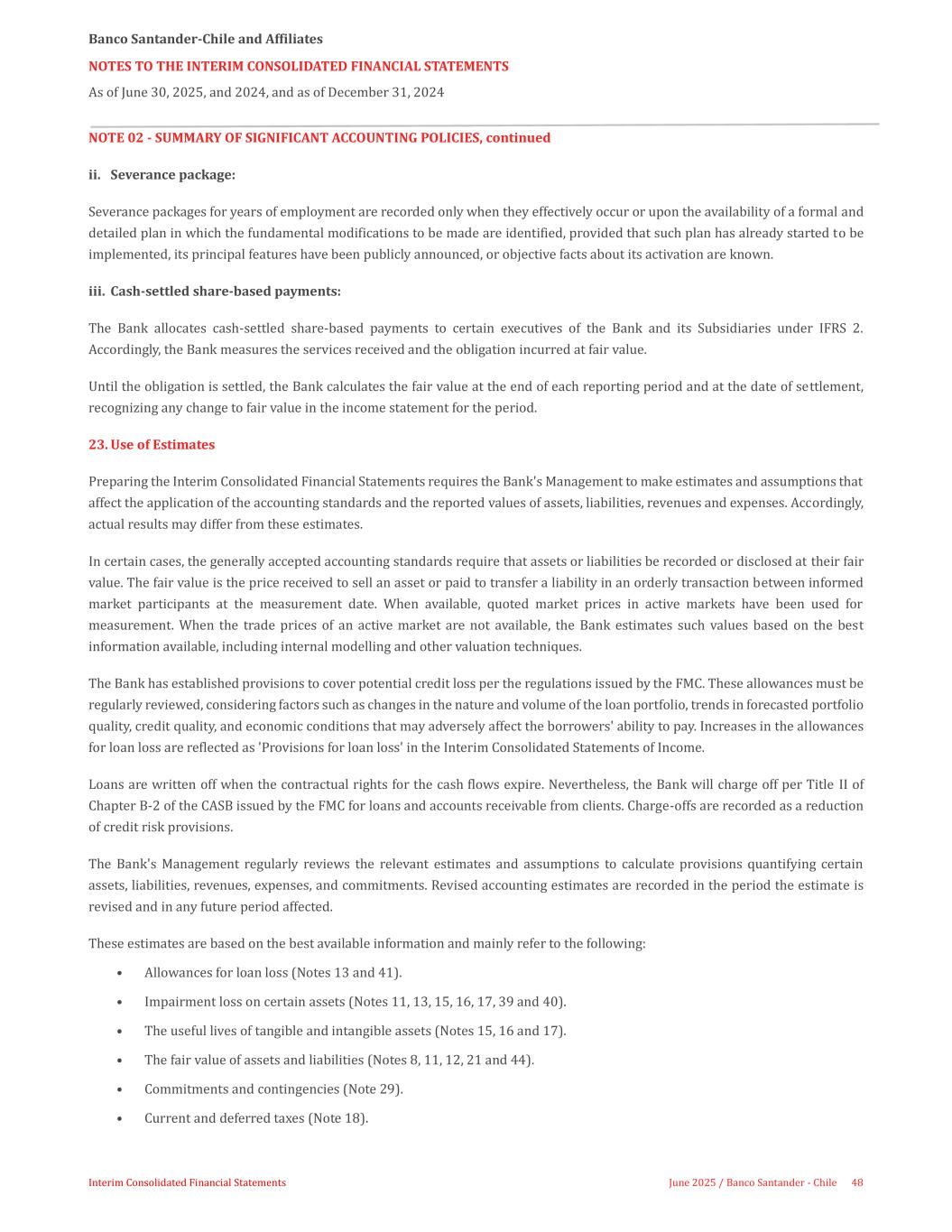 Banco Santander-Chile and Affiliates NOTES TO THE INTERIM CONSOLIDATED FINANCIAL STATEMENTS As of June 30, 2025, and 2024, and as of December 31, 2024 Interim Consolidated Financial Statements June 2025 / Banco Santander - Chile 48 NOTE 02 - SUMMARY OF SIGNIFICANT ACCOUNTING POLICIES, continued ii. Severance package: Severance packages for years of employment are recorded only when they effectively occur or upon the availability of a formal and detailed plan in which the fundamental modifications to be made are identified, provided that such plan has already started to be implemented, its principal features have been publicly announced, or objective facts about its activation are known. iii. Cash-settled share-based payments: The Bank allocates cash-settled share-based payments to certain executives of the Bank and its Subsidiaries under IFRS 2. Accordingly, the Bank measures the services received and the obligation incurred at fair value. Until the obligation is settled, the Bank calculates the fair value at the end of each reporting period and at the date of settlement, recognizing any change to fair value in the income statement for the period. 23. Use of Estimates Preparing the Interim Consolidated Financial Statements requires the Bank's Management to make estimates and assumptions that affect the application of the accounting standards and the reported values of assets, liabilities, revenues and expenses. Accordingly, actual results may differ from these estimates. In certain cases, the generally accepted accounting standards require that assets or liabilities be recorded or disclosed at their fair value. The fair value is the price received to sell an asset or paid to transfer a liability in an orderly transaction between informed market participants at the measurement date. When available, quoted market prices in active markets have been used for measurement. When the trade prices of an active market are not available, the Bank estimates such values based on the best information available, including internal modelling and other valuation techniques. The Bank has established provisions to cover potential credit loss per the regulations issued by the FMC. These allowances must be regularly reviewed, considering factors such as changes in the nature and volume of the loan portfolio, trends in forecasted portfolio quality, credit quality, and economic conditions that may adversely affect the borrowers' ability to pay. Increases in the allowances for loan loss are reflected as 'Provisions for loan loss' in the Interim Consolidated Statements of Income. Loans are written off when the contractual rights for the cash flows expire. Nevertheless, the Bank will charge off per Title II of Chapter B-2 of the CASB issued by the FMC for loans and accounts receivable from clients. Charge-offs are recorded as a reduction of credit risk provisions. The Bank's Management regularly reviews the relevant estimates and assumptions to calculate provisions quantifying certain assets, liabilities, revenues, expenses, and commitments. Revised accounting estimates are recorded in the period the estimate is revised and in any future period affected. These estimates are based on the best available information and mainly refer to the following: Allowances for loan loss (Notes 13 and 41). Impairment loss on certain assets (Notes 11, 13, 15, 16, 17, 39 and 40). The useful lives of tangible and intangible assets (Notes 15, 16 and 17). The fair value of assets and liabilities (Notes 8, 11, 12, 21 and 44). Commitments and contingencies (Note 29). Current and deferred taxes (Note 18).