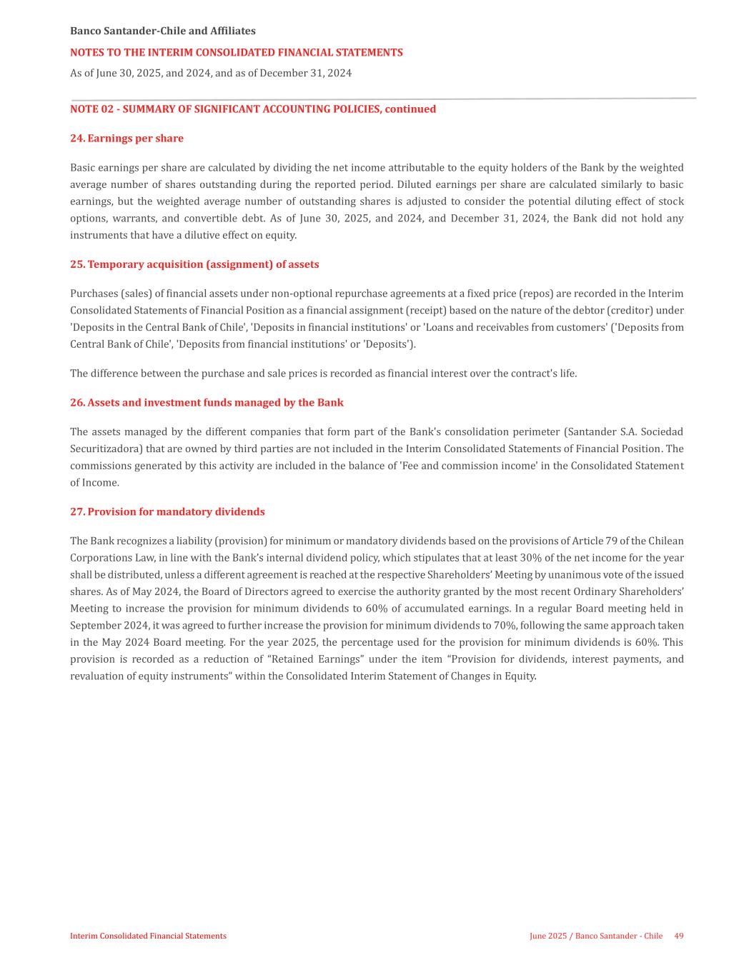 Banco Santander-Chile and Affiliates NOTES TO THE INTERIM CONSOLIDATED FINANCIAL STATEMENTS As of June 30, 2025, and 2024, and as of December 31, 2024 Interim Consolidated Financial Statements June 2025 / Banco Santander - Chile 49 NOTE 02 - SUMMARY OF SIGNIFICANT ACCOUNTING POLICIES, continued 24. Earnings per share Basic earnings per share are calculated by dividing the net income attributable to the equity holders of the Bank by the weighted average number of shares outstanding during the reported period. Diluted earnings per share are calculated similarly to basic earnings, but the weighted average number of outstanding shares is adjusted to consider the potential diluting effect of stock options, warrants, and convertible debt. As of June 30, 2025, and 2024, and December 31, 2024, the Bank did not hold any instruments that have a dilutive effect on equity. 25. Temporary acquisition (assignment) of assets Purchases (sales) of financial assets under non-optional repurchase agreements at a fixed price (repos) are recorded in the Interim Consolidated Statements of Financial Position as a financial assignment (receipt) based on the nature of the debtor (creditor) under 'Deposits in the Central Bank of Chile', 'Deposits in financial institutions' or 'Loans and receivables from customers' ('Deposits from Central Bank of Chile', 'Deposits from financial institutions' or 'Deposits'). The difference between the purchase and sale prices is recorded as financial interest over the contract's life. 26. Assets and investment funds managed by the Bank The assets managed by the different companies that form part of the Bank's consolidation perimeter (Santander S.A. Sociedad Securitizadora) that are owned by third parties are not included in the Interim Consolidated Statements of Financial Position. The commissions generated by this activity are included in the balance of 'Fee and commission income' in the Consolidated Statement of Income. 27. Provision for mandatory dividends The Bank recognizes a liability (provision) for minimum or mandatory dividends based on the provisions of Article 79 of the Chilean the year e issued shares. As of May 2024, the Board of Directors agreed to exercise the authority granted by the most recent Ordin Meeting to increase the provision for minimum dividends to 60% of accumulated earnings. In a regular Board meeting held in September 2024, it was agreed to further increase the provision for minimum dividends to 70%, following the same approach taken in the May 2024 Board meeting. For the year 2025, the percentage used for the provision for minimum dividends is 60%. This and
