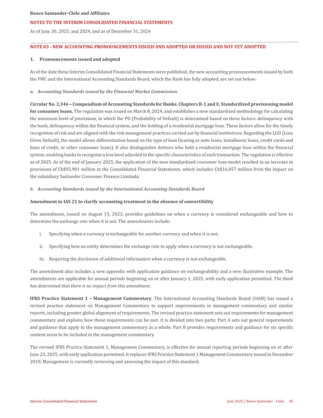 Banco Santander-Chile and Affiliates NOTES TO THE INTERIM CONSOLIDATED FINANCIAL STATEMENTS As of June 30, 2025, and 2024, and as of December 31, 2024 Interim Consolidated Financial Statements June 2025 / Banco Santander - Chile 50 NOTE 03 - NEW ACCOUNTING PRONOUNCEMENTS ISSUED AND ADOPTED OR ISSUED AND NOT YET ADOPTED 1. Pronouncements issued and adopted As of the date these Interim Consolidated Financial Statements were published, the new accounting pronouncements issued by both the FMC and the International Accounting Standards Board, which the Bank has fully adopted, are set out below: a. Accounting Standards issued by the Financial Market Commission. Circular No. 2,346 Compendium of Accounting Standards for Banks. Chapters B-1 and E. Standardized provisioning model for consumer loans. The regulation was issued on March 8, 2024, and establishes a new standardized methodology for calculating the minimum level of provisions, in which the PD (Probability of Default) is determined based on three factors: delinquency with the bank, delinquency within the financial system, and the holding of a residential mortgage loan. These factors allow for the timely recognition of risk and are aligned with the risk management practices carried out by financial institutions. Regarding the LGD (Loss Given Default), the model allows differentiation based on the type of loan (leasing or auto loans, installment loans, credit cards and lines of credit, or other consumer loans). It also distinguishes debtors who hold a residential mortgage loan within the financial system, enabling banks to recognize a loss level adjusted to the specific characteristics of each transaction. The regulation is effective as of 2025. As of the end of January 2025, the application of the new standardized consumer loan model resulted in an increase in provisions of Ch$93,901 million in the Consolidated Financial Statements, which includes Ch$16,057 million from the impact on the subsidiary Santander Consumer Finance Limitada. b. Accounting Standards issued by the International Accounting Standards Board Amendment to IAS 21 to clarify accounting treatment in the absence of convertibility The amendment, issued on August 15, 2023, provides guidelines on when a currency is considered exchangeable and how to determine the exchange rate when it is not. The amendments include: i. Specifying when a currency is exchangeable for another currency and when it is not. ii. Specifying how an entity determines the exchange rate to apply when a currency is not exchangeable. iii. Requiring the disclosure of additional information when a currency is not exchangeable. The amendment also includes a new appendix with application guidance on exchangeability and a new illustrative example. The amendments are applicable for annual periods beginning on or after January 1, 2025, with early application permitted. The Bank has determined that there is no impact from this amendment. IFRS Practice Statement 1 Management Commentary. The International Accounting Standards Board (IASB) has issued a revised practice statement on Management Commentary to support improvements in management commentary and similar reports, including greater global alignment of requirements. The revised practice statement sets out requirements for management commentary and explains how those requirements can be met. It is divided into two parts: Part A sets out general requirements and guidance that apply to the management commentary as a whole. Part B provides requirements and guidance for six specific content areas to be included in the management commentary. The revised IFRS Practice Statement 1, Management Commentary, is effective for annual reporting periods beginning on or after June 23, 2025, with early application permitted. It replaces IFRS Practice Statement 1 Management Commentary issued in December 2010. Management is currently reviewing and assessing the impact of this standard.
