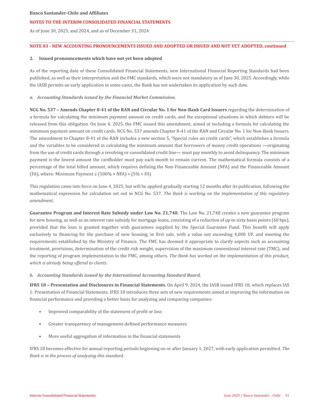 Banco Santander-Chile and Affiliates NOTES TO THE INTERIM CONSOLIDATED FINANCIAL STATEMENTS As of June 30, 2025, and 2024, and as of December 31, 2024 Interim Consolidated Financial Statements June 2025 / Banco Santander - Chile 51 NOTE 03 - NEW ACCOUNTING PRONOUNCEMENTS ISSUED AND ADOPTED OR ISSUED AND NOT YET ADOPTED, continued 2. Issued pronouncements which have not yet been adopted As of the reporting date of these Consolidated Financial Statements, new International Financial Reporting Standards had been published, as well as their interpretation and the FMC standards, which were not mandatory as of June 30, 2025. Accordingly, while the IASB permits an early application in some cases, the Bank has not undertaken its application by such date. a. Accounting Standards issued by the Financial Market Commission. NCG No. 537 Amends Chapter 8-41 of the RAN and Circular No. 1 for Non-Bank Card Issuers regarding the determination of a formula for calculating the minimum payment amount on credit cards, and the exceptional situations in which debtors will be released from this obligation. On June 4, 2025, the FMC issued this amendment, aimed at including a formula for calculating the minimum payment amount on credit cards. NCG No. 537 amends Chapter 8-41 of the RAN and Circular No. 1 for Non-Bank Issuers. The amendment to Chapter 8- and the variables to be considered in calculating the minimum amount that borrowers of money credit operations originating from the use of credit cards through a revolving or consolidated credit line must pay monthly to avoid delinquency. The minimum payment is the lowest amount the cardholder must pay each month to remain current. The mathematical formula consists of a percentage of the total billed amount, which requires defining the Non-Financeable Amount (NFA) and the Financeable Amount (FA), where: This regulation came into force on June 4, 2025, but will be applied gradually starting 12 months after its publication, following the mathematical expression for calculation set out in NCG No. 537. The Bank is working on the implementation of this regulatory amendment. Guarantee Program and Interest Rate Subsidy under Law No. 21,748. The Law No. 21,748 creates a new guarantee program for new housing, as well as an interest rate subsidy for mortgage loans, consisting of a reduction of up to sixty basis points (60 bps), provided that the loan is granted together with guarantees supplied by the Special Guarantee Fund. This benefit will apply exclusively to financing for the purchase of new housing, in first sale, with a value not exceeding 4,000 UF, and meeting the requirements established by the Ministry of Finance. The FMC has deemed it appropriate to clarify aspects such as accounting treatment, provisions, determination of the credit risk weight, supervision of the maximum conventional interest rate (TMC), and the reporting of program implementation to the FMC, among others. The Bank has worked on the implementation of this product, which is already being offered to clients. b. Accounting Standards issued by the International Accounting Standard Board. IFRS 18 Presentation and Disclosures in Financial Statements. On April 9, 2024, the IASB issued IFRS 18, which replaces IAS 1: Presentation of Financial Statements. IFRS 18 introduces three sets of new requirements aimed at improving the information on financial performance and providing a better basis for analyzing and comparing companies: Improved comparability of the statement of profit or loss Greater transparency of management-defined performance measures More useful aggregation of information in the financial statements IFRS 18 becomes effective for annual reporting periods beginning on or after January 1, 2027, with early application permitted. The Bank is in the process of analyzing this standard.