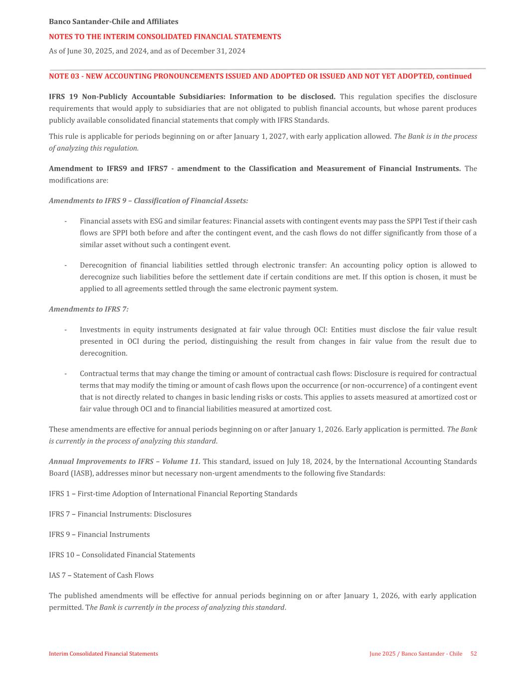 Banco Santander-Chile and Affiliates NOTES TO THE INTERIM CONSOLIDATED FINANCIAL STATEMENTS As of June 30, 2025, and 2024, and as of December 31, 2024 Interim Consolidated Financial Statements June 2025 / Banco Santander - Chile 52 NOTE 03 - NEW ACCOUNTING PRONOUNCEMENTS ISSUED AND ADOPTED OR ISSUED AND NOT YET ADOPTED, continued IFRS 19 Non-Publicly Accountable Subsidiaries: Information to be disclosed. This regulation specifies the disclosure requirements that would apply to subsidiaries that are not obligated to publish financial accounts, but whose parent produces publicly available consolidated financial statements that comply with IFRS Standards. This rule is applicable for periods beginning on or after January 1, 2027, with early application allowed. The Bank is in the process of analyzing this regulation. Amendment to IFRS9 and IFRS7 - amendment to the Classification and Measurement of Financial Instruments. The modifications are: Amendments to IFRS 9 Classification of Financial Assets: - Financial assets with ESG and similar features: Financial assets with contingent events may pass the SPPI Test if their cash flows are SPPI both before and after the contingent event, and the cash flows do not differ significantly from those of a similar asset without such a contingent event. - Derecognition of financial liabilities settled through electronic transfer: An accounting policy option is allowed to derecognize such liabilities before the settlement date if certain conditions are met. If this option is chosen, it must be applied to all agreements settled through the same electronic payment system. Amendments to IFRS 7: - Investments in equity instruments designated at fair value through OCI: Entities must disclose the fair value result presented in OCI during the period, distinguishing the result from changes in fair value from the result due to derecognition. - Contractual terms that may change the timing or amount of contractual cash flows: Disclosure is required for contractual terms that may modify the timing or amount of cash flows upon the occurrence (or non-occurrence) of a contingent event that is not directly related to changes in basic lending risks or costs. This applies to assets measured at amortized cost or fair value through OCI and to financial liabilities measured at amortized cost. These amendments are effective for annual periods beginning on or after January 1, 2026. Early application is permitted. The Bank is currently in the process of analyzing this standard. Annual Improvements to IFRS Volume 11. This standard, issued on July 18, 2024, by the International Accounting Standards Board (IASB), addresses minor but necessary non-urgent amendments to the following five Standards: IFRS 1 First-time Adoption of International Financial Reporting Standards IFRS 7 Financial Instruments: Disclosures IFRS 9 Financial Instruments IFRS 10 Consolidated Financial Statements IAS 7 Statement of Cash Flows The published amendments will be effective for annual periods beginning on or after January 1, 2026, with early application permitted. The Bank is currently in the process of analyzing this standard.