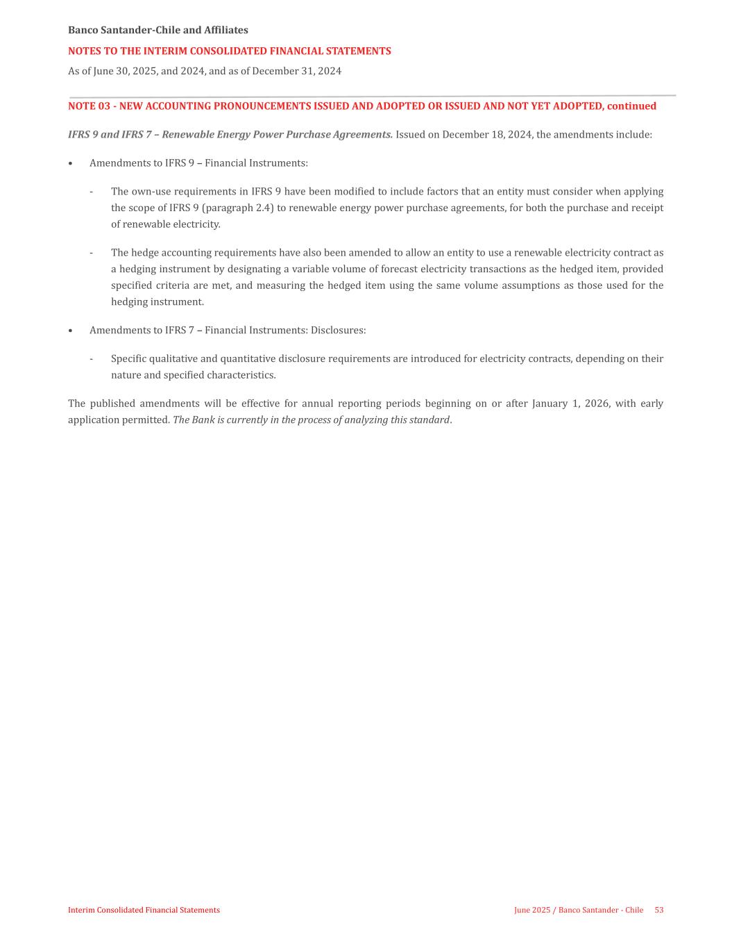 Banco Santander-Chile and Affiliates NOTES TO THE INTERIM CONSOLIDATED FINANCIAL STATEMENTS As of June 30, 2025, and 2024, and as of December 31, 2024 Interim Consolidated Financial Statements June 2025 / Banco Santander - Chile 53 NOTE 03 - NEW ACCOUNTING PRONOUNCEMENTS ISSUED AND ADOPTED OR ISSUED AND NOT YET ADOPTED, continued IFRS 9 and IFRS 7 Renewable Energy Power Purchase Agreements. Issued on December 18, 2024, the amendments include: Amendments to IFRS 9 Financial Instruments: - The own-use requirements in IFRS 9 have been modified to include factors that an entity must consider when applying the scope of IFRS 9 (paragraph 2.4) to renewable energy power purchase agreements, for both the purchase and receipt of renewable electricity. - The hedge accounting requirements have also been amended to allow an entity to use a renewable electricity contract as a hedging instrument by designating a variable volume of forecast electricity transactions as the hedged item, provided specified criteria are met, and measuring the hedged item using the same volume assumptions as those used for the hedging instrument. Amendments to IFRS 7 Financial Instruments: Disclosures: - Specific qualitative and quantitative disclosure requirements are introduced for electricity contracts, depending on their nature and specified characteristics. The published amendments will be effective for annual reporting periods beginning on or after January 1, 2026, with early application permitted. The Bank is currently in the process of analyzing this standard.