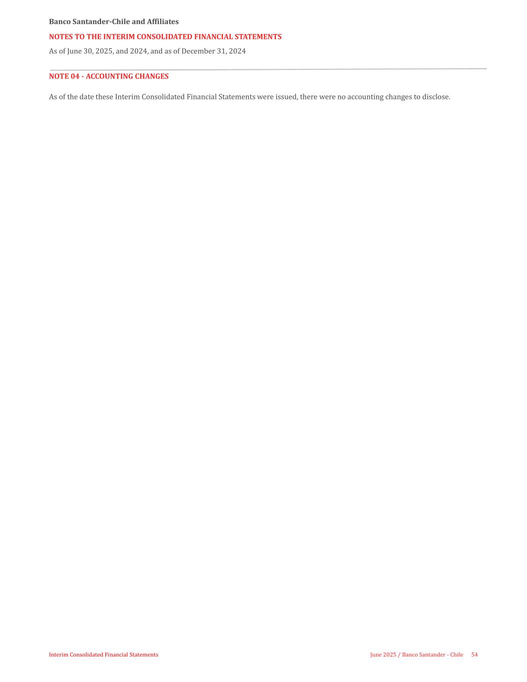 Banco Santander-Chile and Affiliates NOTES TO THE INTERIM CONSOLIDATED FINANCIAL STATEMENTS As of June 30, 2025, and 2024, and as of December 31, 2024 Interim Consolidated Financial Statements June 2025 / Banco Santander - Chile 54 NOTE 04 - ACCOUNTING CHANGES As of the date these Interim Consolidated Financial Statements were issued, there were no accounting changes to disclose.