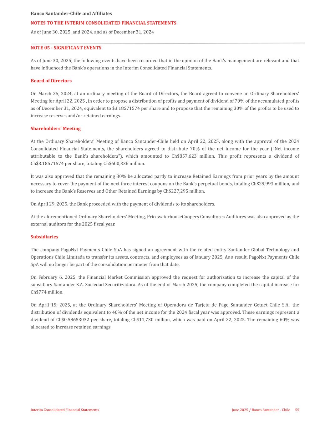 Banco Santander-Chile and Affiliates NOTES TO THE INTERIM CONSOLIDATED FINANCIAL STATEMENTS As of June 30, 2025, and 2024, and as of December 31, 2024 Interim Consolidated Financial Statements June 2025 / Banco Santander - Chile 55 NOTE 05 - SIGNIFICANT EVENTS As of June 30, 2025, the following events have been recorded that in the opinion of the Bank's management are relevant and that have influenced the Bank's operations in the Interim Consolidated Financial Statements. Board of Directors On March 25, 2024, at an ordinary meeting of the Board of Directors, the Board agreed to convene an Ordinary Shareholders' Meeting for April 22, 2025 , in order to propose a distribution of profits and payment of dividend of 70% of the accumulated profits as of December 31, 2024, equivalent to $3.18571574 per share and to propose that the remaining 30% of the profits to be used to increase reserves and/or retained earnings. -Chile held on April 22, 2025, along with the approval of the 2024 attributable Ch$3.18571574 per share, totaling Ch$600,336 million. It was also approved that the remaining 30% be allocated partly to increase Retained Earnings from prior years by the amount and to On April 29, 2025, the Bank proceeded with the payment of dividends to its shareholders. external auditors for the 2025 fiscal year. Subsidiaries The company PagoNxt Payments Chile SpA has signed an agreement with the related entity Santander Global Technology and Operations Chile Limitada to transfer its assets, contracts, and employees as of January 2025. As a result, PagoNxt Payments Chile SpA will no longer be part of the consolidation perimeter from that date. On February 6, 2025, the Financial Market Commission approved the request for authorization to increase the capital of the subsidiary Santander S.A. Sociedad Securitizadora. As of the end of March 2025, the company completed the capital increase for Ch$774 million. distribution of dividends equivalent to 40% of the net income for the 2024 fiscal year was approved. These earnings represent a dividend of Ch$0.58653032 per share, totaling Ch$11,730 million, which was paid on April 22, 2025. The remaining 60% was allocated to increase retained earnings