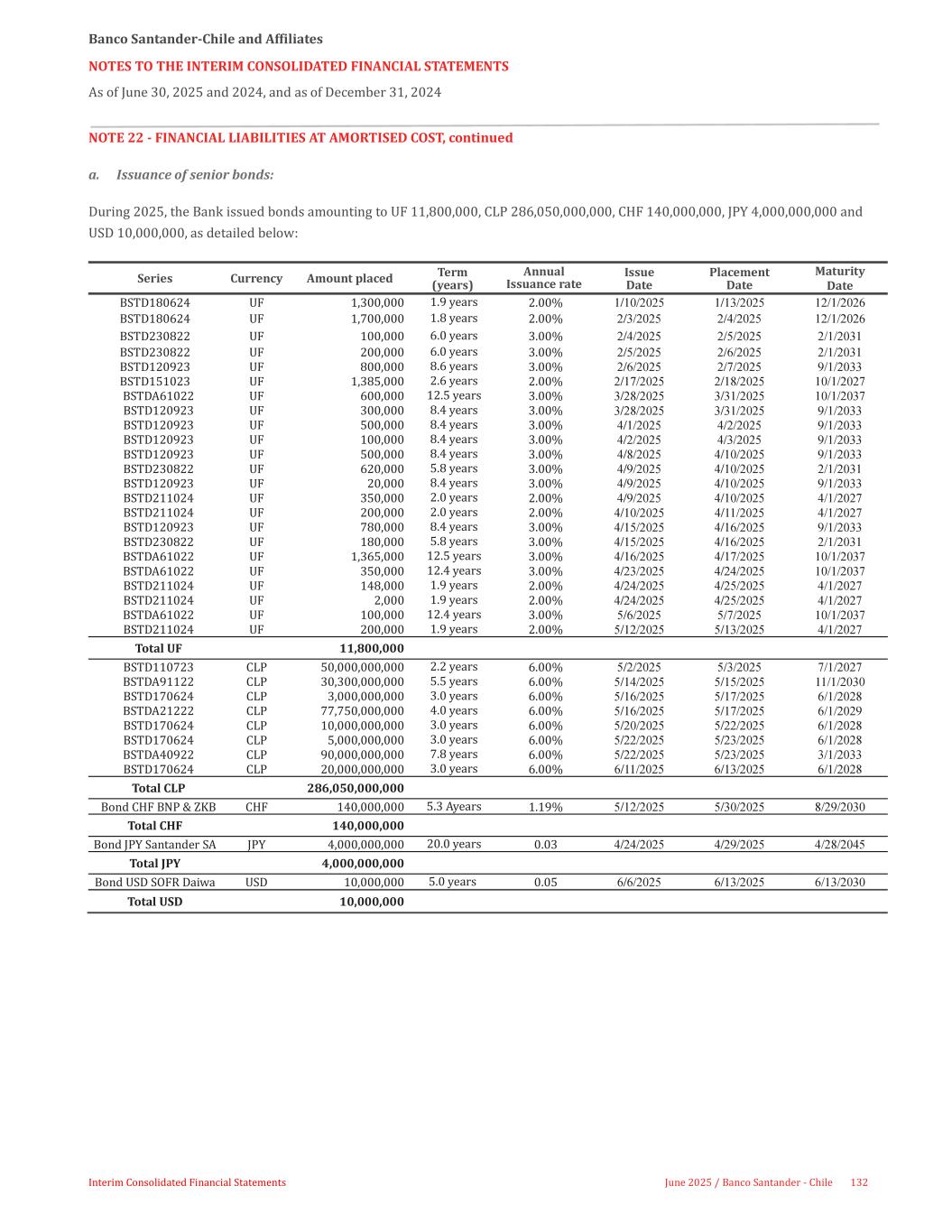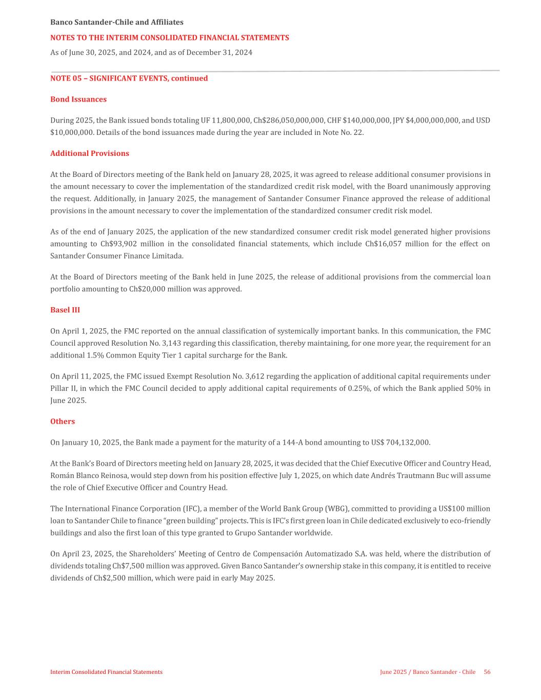 Banco Santander-Chile and Affiliates NOTES TO THE INTERIM CONSOLIDATED FINANCIAL STATEMENTS As of June 30, 2025, and 2024, and as of December 31, 2024 Interim Consolidated Financial Statements June 2025 / Banco Santander - Chile 56 NOTE 05 SIGNIFICANT EVENTS, continued Bond Issuances During 2025, the Bank issued bonds totaling UF 11,800,000, Ch$286,050,000,000, CHF $140,000,000, JPY $4,000,000,000, and USD $10,000,000. Details of the bond issuances made during the year are included in Note No. 22. Additional Provisions At the Board of Directors meeting of the Bank held on January 28, 2025, it was agreed to release additional consumer provisions in the amount necessary to cover the implementation of the standardized credit risk model, with the Board unanimously approving the request. Additionally, in January 2025, the management of Santander Consumer Finance approved the release of additional provisions in the amount necessary to cover the implementation of the standardized consumer credit risk model. As of the end of January 2025, the application of the new standardized consumer credit risk model generated higher provisions amounting to Ch$93,902 million in the consolidated financial statements, which include Ch$16,057 million for the effect on Santander Consumer Finance Limitada. At the Board of Directors meeting of the Bank held in June 2025, the release of additional provisions from the commercial loan portfolio amounting to Ch$20,000 million was approved. Basel III On April 1, 2025, the FMC reported on the annual classification of systemically important banks. In this communication, the FMC Council approved Resolution No. 3,143 regarding this classification, thereby maintaining, for one more year, the requirement for an additional 1.5% Common Equity Tier 1 capital surcharge for the Bank. On April 11, 2025, the FMC issued Exempt Resolution No. 3,612 regarding the application of additional capital requirements under Pillar II, in which the FMC Council decided to apply additional capital requirements of 0.25%, of which the Bank applied 50% in June 2025. Others On January 10, 2025, the Bank made a payment for the maturity of a 144-A bond amounting to US$ 704,132,000. y Head, Román Blanco Reinosa, would step down from his position effective July 1, 2025, on which date Andrés Trautmann Buc will assume the role of Chief Executive Officer and Country Head. The International Finance Corporation (IFC), a member of the World Bank Group (WBG), committed to providing a US$100 million o eco-friendly buildings and also the first loan of this type granted to Grupo Santander worldwide. receive dividends of Ch$2,500 million, which were paid in early May 2025.