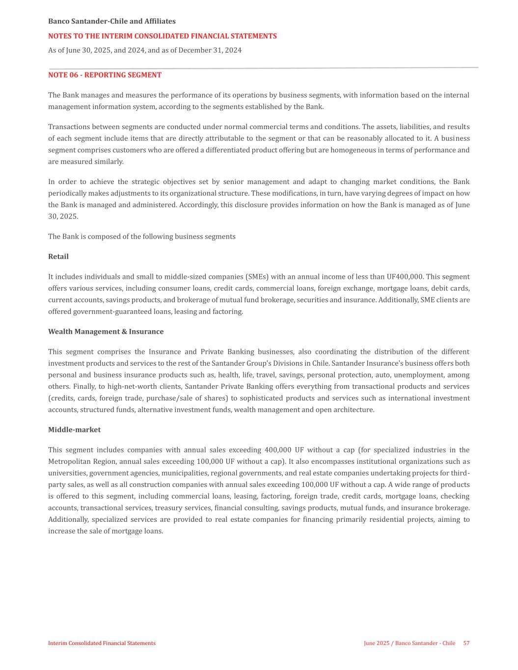 Banco Santander-Chile and Affiliates NOTES TO THE INTERIM CONSOLIDATED FINANCIAL STATEMENTS As of June 30, 2025, and 2024, and as of December 31, 2024 Interim Consolidated Financial Statements June 2025 / Banco Santander - Chile 57 NOTE 06 - REPORTING SEGMENT The Bank manages and measures the performance of its operations by business segments, with information based on the internal management information system, according to the segments established by the Bank. Transactions between segments are conducted under normal commercial terms and conditions. The assets, liabilities, and results of each segment include items that are directly attributable to the segment or that can be reasonably allocated to it. A business segment comprises customers who are offered a differentiated product offering but are homogeneous in terms of performance and are measured similarly. In order to achieve the strategic objectives set by senior management and adapt to changing market conditions, the Bank periodically makes adjustments to its organizational structure. These modifications, in turn, have varying degrees of impact on how the Bank is managed and administered. Accordingly, this disclosure provides information on how the Bank is managed as of June 30, 2025. The Bank is composed of the following business segments Retail It includes individuals and small to middle-sized companies (SMEs) with an annual income of less than UF400,000. This segment offers various services, including consumer loans, credit cards, commercial loans, foreign exchange, mortgage loans, debit cards, current accounts, savings products, and brokerage of mutual fund brokerage, securities and insurance. Additionally, SME clients are offered government-guaranteed loans, leasing and factoring. Wealth Management & Insurance This segment comprises the Insurance and Private Banking businesses, also coordinating the distribution of the different investment products and services to the rest of the Santander Group's Divisions in Chile. Santander Insurance's business offers both personal and business insurance products such as, health, life, travel, savings, personal protection, auto, unemployment, among others. Finally, to high-net-worth clients, Santander Private Banking offers everything from transactional products and services (credits, cards, foreign trade, purchase/sale of shares) to sophisticated products and services such as international investment accounts, structured funds, alternative investment funds, wealth management and open architecture. Middle-market This segment includes companies with annual sales exceeding 400,000 UF without a cap (for specialized industries in the Metropolitan Region, annual sales exceeding 100,000 UF without a cap). It also encompasses institutional organizations such as universities, government agencies, municipalities, regional governments, and real estate companies undertaking projects for third- party sales, as well as all construction companies with annual sales exceeding 100,000 UF without a cap. A wide range of products is offered to this segment, including commercial loans, leasing, factoring, foreign trade, credit cards, mortgage loans, checking accounts, transactional services, treasury services, financial consulting, savings products, mutual funds, and insurance brokerage. Additionally, specialized services are provided to real estate companies for financing primarily residential projects, aiming to increase the sale of mortgage loans.