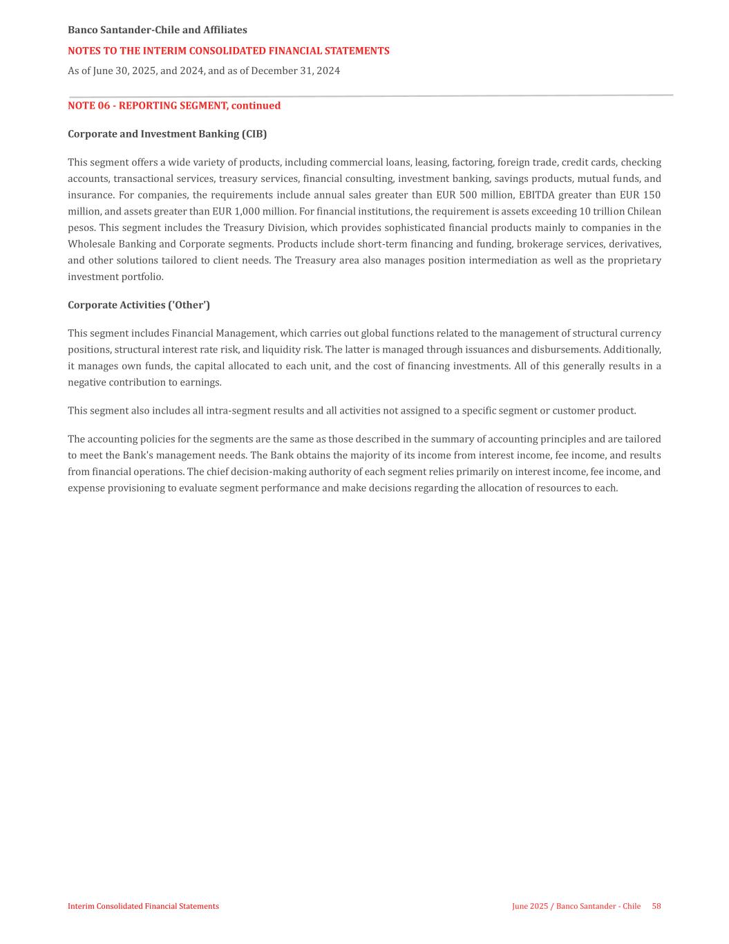 Banco Santander-Chile and Affiliates NOTES TO THE INTERIM CONSOLIDATED FINANCIAL STATEMENTS As of June 30, 2025, and 2024, and as of December 31, 2024 Interim Consolidated Financial Statements June 2025 / Banco Santander - Chile 58 NOTE 06 - REPORTING SEGMENT, continued Corporate and Investment Banking (CIB) This segment offers a wide variety of products, including commercial loans, leasing, factoring, foreign trade, credit cards, checking accounts, transactional services, treasury services, financial consulting, investment banking, savings products, mutual funds, and insurance. For companies, the requirements include annual sales greater than EUR 500 million, EBITDA greater than EUR 150 million, and assets greater than EUR 1,000 million. For financial institutions, the requirement is assets exceeding 10 trillion Chilean pesos. This segment includes the Treasury Division, which provides sophisticated financial products mainly to companies in the Wholesale Banking and Corporate segments. Products include short-term financing and funding, brokerage services, derivatives, and other solutions tailored to client needs. The Treasury area also manages position intermediation as well as the proprietary investment portfolio. Corporate Activities ('Other') This segment includes Financial Management, which carries out global functions related to the management of structural currency positions, structural interest rate risk, and liquidity risk. The latter is managed through issuances and disbursements. Additionally, it manages own funds, the capital allocated to each unit, and the cost of financing investments. All of this generally results in a negative contribution to earnings. This segment also includes all intra-segment results and all activities not assigned to a specific segment or customer product. The accounting policies for the segments are the same as those described in the summary of accounting principles and are tailored to meet the Bank's management needs. The Bank obtains the majority of its income from interest income, fee income, and results from financial operations. The chief decision-making authority of each segment relies primarily on interest income, fee income, and expense provisioning to evaluate segment performance and make decisions regarding the allocation of resources to each.