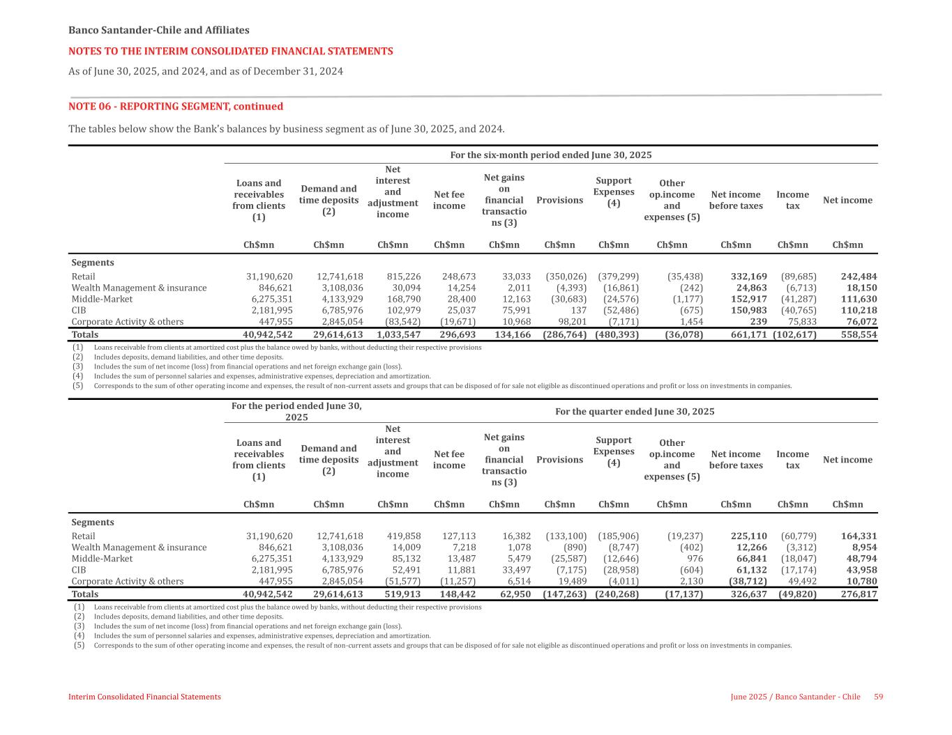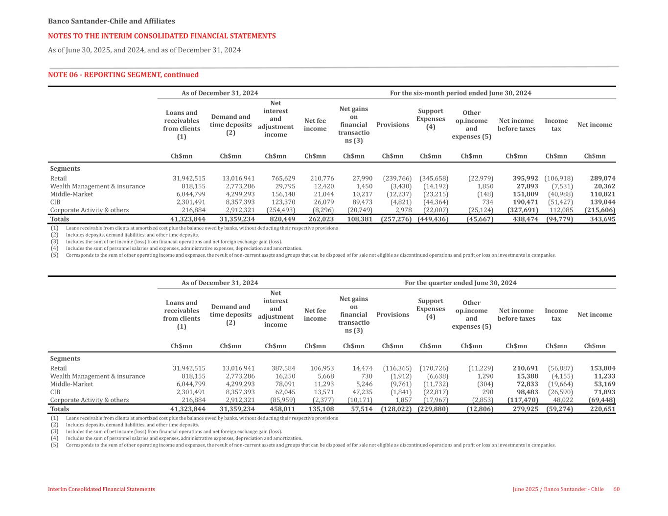 Banco Santander-Chile and Affiliates NOTES TO THE INTERIM CONSOLIDATED FINANCIAL STATEMENTS As of June 30, 2025, and 2024, and as of December 31, 2024 Interim Consolidated Financial Statements June 2025 / Banco Santander - Chile 60 NOTE 06 - REPORTING SEGMENT, continued As of December 31, 2024 For the six-month period ended June 30, 2024 Loans and receivables from clients (1) Demand and time deposits (2) Net interest and adjustment income Net fee income Net gains on financial transactio ns (3) Provisions Support Expenses (4) Other op.income and expenses (5) Net income before taxes Income tax Net income Ch$mn Ch$mn Ch$mn Ch$mn Ch$mn Ch$mn Ch$mn Ch$mn Ch$mn Ch$mn Ch$mn Segments Retail 31,942,515 13,016,941 765,629 210,776 27,990 (239,766) (345,658) (22,979) 395,992 (106,918) 289,074 Wealth Management & insurance 818,155 2,773,286 29,795 12,420 1,450 (3,430) (14,192) 1,850 27,893 (7,531) 20,362 Middle-Market 6,044,799 4,299,293 156,148 21,044 10,217 (12,237) (23,215) (148) 151,809 (40,988) 110,821 CIB 2,301,491 8,357,393 123,370 26,079 89,473 (4,821) (44,364) 734 190,471 (51,427) 139,044 Corporate Activity & others 216,884 2,912,321 (254,493) (8,296) (20,749) 2,978 (22,007) (25,124) (327,691) 112,085 (215,606) Totals 41,323,844 31,359,234 820,449 262,023 108,381 (257,276) (449,436) (45,667) 438,474 (94,779) 343,695 (1) Loans receivable from clients at amortized cost plus the balance owed by banks, without deducting their respective provisions (2) Includes deposits, demand liabilities, and other time deposits. (3) Includes the sum of net income (loss) from financial operations and net foreign exchange gain (loss). (4) Includes the sum of personnel salaries and expenses, administrative expenses, depreciation and amortization. (5) Corresponds to the sum of other operating income and expenses, the result of non-current assets and groups that can be disposed of for sale not eligible as discontinued operations and profit or loss on investments in companies. As of December 31, 2024 For the quarter ended June 30, 2024 Loans and receivables from clients (1) Demand and time deposits (2) Net interest and adjustment income Net fee income Net gains on financial transactio ns (3) Provisions Support Expenses (4) Other op.income and expenses (5) Net income before taxes Income tax Net income Ch$mn Ch$mn Ch$mn Ch$mn Ch$mn Ch$mn Ch$mn Ch$mn Ch$mn Ch$mn Ch$mn Segments Retail 31,942,515 13,016,941 387,584 106,953 14,474 (116,365) (170,726) (11,229) 210,691 (56,887) 153,804 Wealth Management & insurance 818,155 2,773,286 16,250 5,668 730 (1,912) (6,638) 1,290 15,388 (4,155) 11,233 Middle-Market 6,044,799 4,299,293 78,091 11,293 5,246 (9,761) (11,732) (304) 72,833 (19,664) 53,169 CIB 2,301,491 8,357,393 62,045 13,571 47,235 (1,841) (22,817) 290 98,483 (26,590) 71,893 Corporate Activity & others 216,884 2,912,321 (85,959) (2,377) (10,171) 1,857 (17,967) (2,853) (117,470) 48,022 (69,448) Totals 41,323,844 31,359,234 458,011 135,108 57,514 (128,022) (229,880) (12,806) 279,925 (59,274) 220,651 (1) Loans receivable from clients at amortized cost plus the balance owed by banks, without deducting their respective provisions (2) Includes deposits, demand liabilities, and other time deposits. (3) Includes the sum of net income (loss) from financial operations and net foreign exchange gain (loss). (4) Includes the sum of personnel salaries and expenses, administrative expenses, depreciation and amortization. (5) Corresponds to the sum of other operating income and expenses, the result of non-current assets and groups that can be disposed of for sale not eligible as discontinued operations and profit or loss on investments in companies.