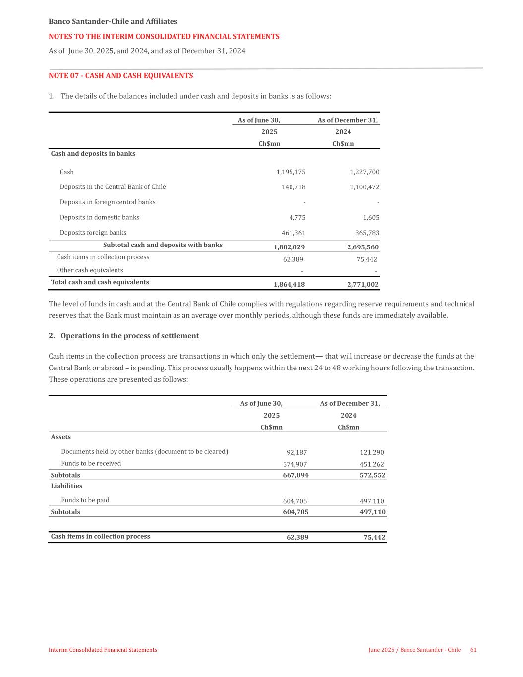 Banco Santander-Chile and Affiliates NOTES TO THE INTERIM CONSOLIDATED FINANCIAL STATEMENTS As of June 30, 2025, and 2024, and as of December 31, 2024 Interim Consolidated Financial Statements June 2025 / Banco Santander - Chile 61 NOTE 07 - CASH AND CASH EQUIVALENTS 1. The details of the balances included under cash and deposits in banks is as follows: As of June 30, As of December 31, 2025 2024 Ch$mn Ch$mn Cash and deposits in banks Cash 1,195,175 1,227,700 Deposits in the Central Bank of Chile 140,718 1,100,472 Deposits in foreign central banks - - Deposits in domestic banks 4,775 1,605 Deposits foreign banks 461,361 365,783 Subtotal cash and deposits with banks 1,802,029 2,695,560 Cash items in collection process 62.389 75,442 Other cash equivalents - - Total cash and cash equivalents 1,864,418 2,771,002 The level of funds in cash and at the Central Bank of Chile complies with regulations regarding reserve requirements and technical reserves that the Bank must maintain as an average over monthly periods, although these funds are immediately available. 2. Operations in the process of settlement Cash items in the collection process are transactions in which only the settlement that will increase or decrease the funds at the Central Bank or abroad is pending. This process usually happens within the next 24 to 48 working hours following the transaction. These operations are presented as follows: As of June 30, As of December 31, 2025 2024 Ch$mn Ch$mn Assets Documents held by other banks (document to be cleared) 92,187 121.290 Funds to be received 574,907 451.262 Subtotals 667,094 572,552 Liabilities Funds to be paid 604,705 497.110 Subtotals 604,705 497,110 Cash items in collection process 62,389 75,442