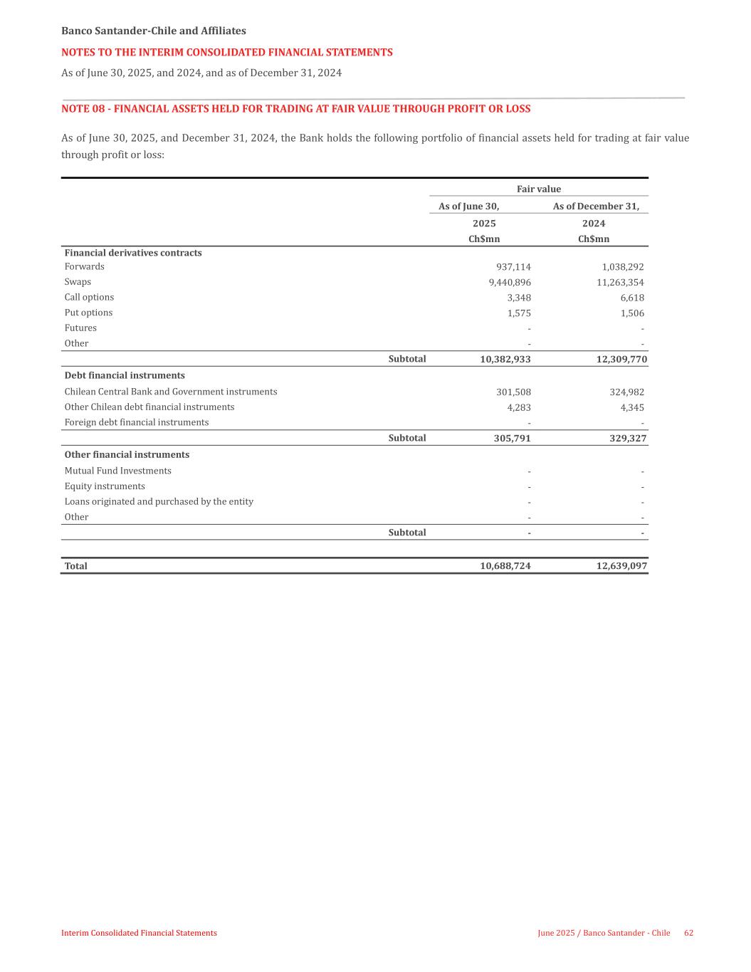Banco Santander-Chile and Affiliates NOTES TO THE INTERIM CONSOLIDATED FINANCIAL STATEMENTS As of June 30, 2025, and 2024, and as of December 31, 2024 Interim Consolidated Financial Statements June 2025 / Banco Santander - Chile 62 NOTE 08 - FINANCIAL ASSETS HELD FOR TRADING AT FAIR VALUE THROUGH PROFIT OR LOSS As of June 30, 2025, and December 31, 2024, the Bank holds the following portfolio of financial assets held for trading at fair value through profit or loss: Fair value As of June 30, As of December 31, 2025 2024 Ch$mn Ch$mn Financial derivatives contracts Forwards 937,114 1,038,292 Swaps 9,440,896 11,263,354 Call options 3,348 6,618 Put options 1,575 1,506 Futures - - Other - - Subtotal 10,382,933 12,309,770 Debt financial instruments Chilean Central Bank and Government instruments 301,508 324,982 Other Chilean debt financial instruments 4,283 4,345 Foreign debt financial instruments - - Subtotal 305,791 329,327 Other financial instruments Mutual Fund Investments - - Equity instruments - - Loans originated and purchased by the entity - - Other - - Subtotal - - Total 10,688,724 12,639,097