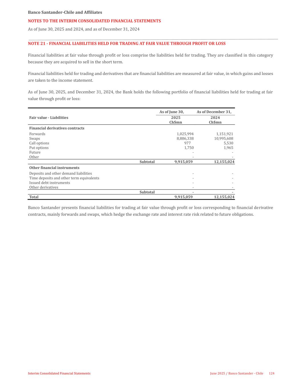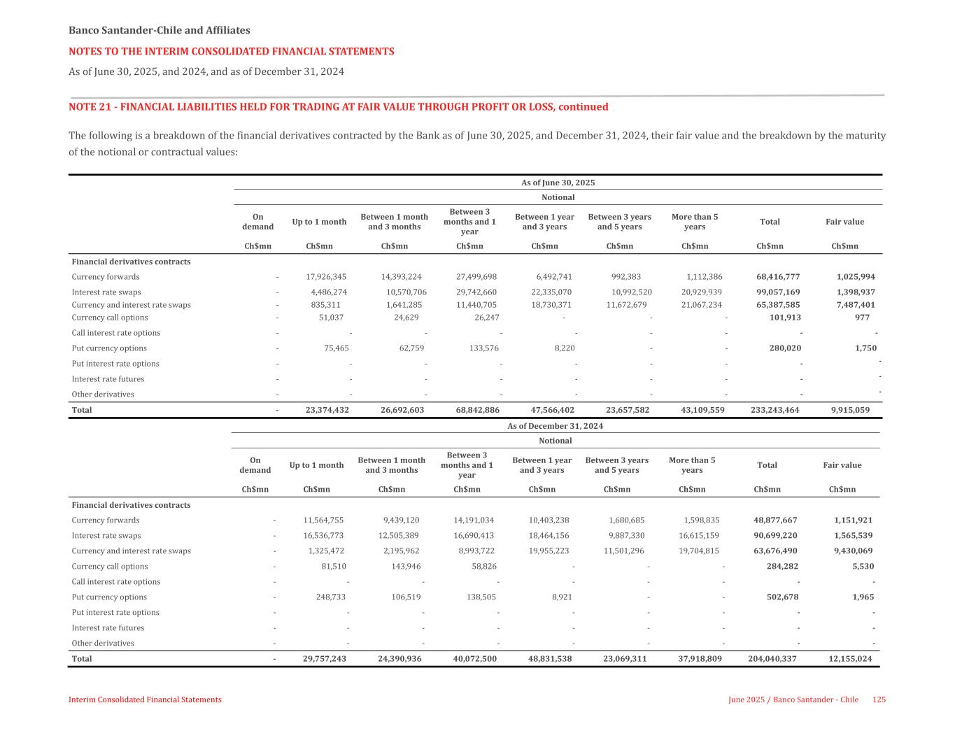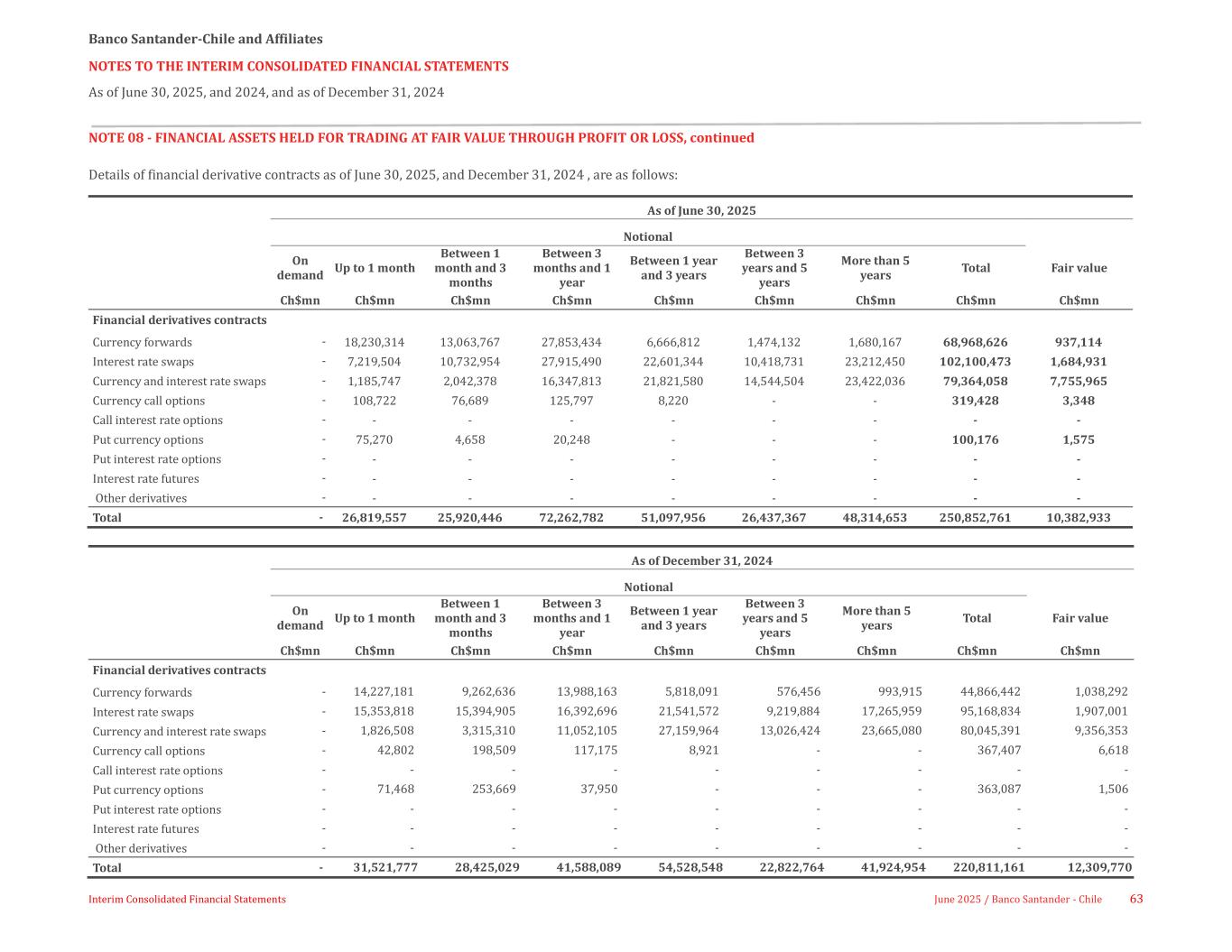 Banco Santander-Chile and Affiliates NOTES TO THE INTERIM CONSOLIDATED FINANCIAL STATEMENTS As of June 30, 2025, and 2024, and as of December 31, 2024 Interim Consolidated Financial Statements June 2025 / Banco Santander - Chile 63 NOTE 08 - FINANCIAL ASSETS HELD FOR TRADING AT FAIR VALUE THROUGH PROFIT OR LOSS, continued Details of financial derivative contracts as of June 30, 2025, and December 31, 2024 , are as follows: As of June 30, 2025 Notional On demand Up to 1 month Between 1 month and 3 months Between 3 months and 1 year Between 1 year and 3 years Between 3 years and 5 years More than 5 years Total Fair value Ch$mn Ch$mn Ch$mn Ch$mn Ch$mn Ch$mn Ch$mn Ch$mn Ch$mn Financial derivatives contracts Currency forwards - 18,230,314 13,063,767 27,853,434 6,666,812 1,474,132 1,680,167 68,968,626 937,114 Interest rate swaps - 7,219,504 10,732,954 27,915,490 22,601,344 10,418,731 23,212,450 102,100,473 1,684,931 Currency and interest rate swaps - 1,185,747 2,042,378 16,347,813 21,821,580 14,544,504 23,422,036 79,364,058 7,755,965 Currency call options - 108,722 76,689 125,797 8,220 - - 319,428 3,348 Call interest rate options - - - - - - - - - Put currency options - 75,270 4,658 20,248 - - - 100,176 1,575 Put interest rate options - - - - - - - - - Interest rate futures - - - - - - - - - Other derivatives - - - - - - - - - Total - 26,819,557 25,920,446 72,262,782 51,097,956 26,437,367 48,314,653 250,852,761 10,382,933 As of December 31, 2024 Notional On demand Up to 1 month Between 1 month and 3 months Between 3 months and 1 year Between 1 year and 3 years Between 3 years and 5 years More than 5 years Total Fair value Ch$mn Ch$mn Ch$mn Ch$mn Ch$mn Ch$mn Ch$mn Ch$mn Ch$mn Financial derivatives contracts Currency forwards - 14,227,181 9,262,636 13,988,163 5,818,091 576,456 993,915 44,866,442 1,038,292 Interest rate swaps - 15,353,818 15,394,905 16,392,696 21,541,572 9,219,884 17,265,959 95,168,834 1,907,001 Currency and interest rate swaps - 1,826,508 3,315,310 11,052,105 27,159,964 13,026,424 23,665,080 80,045,391 9,356,353 Currency call options - 42,802 198,509 117,175 8,921 - - 367,407 6,618 Call interest rate options - - - - - - - - - Put currency options - 71,468 253,669 37,950 - - - 363,087 1,506 Put interest rate options - - - - - - - - - Interest rate futures - - - - - - - - - Other derivatives - - - - - - - - - Total - 31,521,777 28,425,029 41,588,089 54,528,548 22,822,764 41,924,954 220,811,161 12,309,770