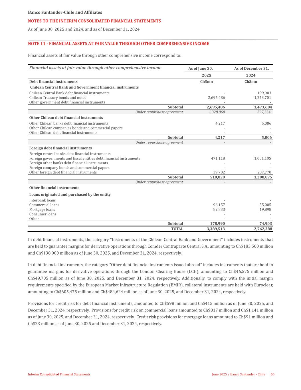 Banco Santander-Chile and Affiliates NOTES TO THE INTERIM CONSOLIDATED FINANCIAL STATEMENTS As of June 30, 2025 and 2024, and as of December 31, 2024 Interim Consolidated Financial Statements June 2025 / Banco Santander - Chile 66 NOTE 11 - FINANCIAL ASSETS AT FAIR VALUE THROUGH OTHER COMPREHENSIVE INCOME Financial assets at fair value through other comprehensive income correspond to: Financial assets at fair value through other comprehensive income As of June 30, As of December 31, 2025 2024 Debt financial instruments Ch$mn Ch$mn Chilean Central Bank and Government financial instruments Chilean Central Bank debt financial instruments - 199,903 Chilean Treasury bonds and notes 2,695,486 1,273,701 Other government debt financial instruments - - Subtotal 2,695,486 1,473,604 Under repurchase agreement 1,328,860 397,334 Other Chilean debt financial instruments Other Chilean banks debt financial instruments 4,217 5,006 Other Chilean companies bonds and commercial papers - - Other Chilean debt financial instruments - - Subtotal 4,217 5,006 Under repurchase agreement - - Foreign debt financial instruments Foreign central banks debt financial instruments - - Foreign governments and fiscal entities debt financial instruments 471,118 1,001,105 Foreign other banks debt financial instruments - - Foreign company bonds and commercial papers - - Other foreign debt financial instruments 39,702 207,770 Subtotal 510,820 1,208,875 Under repurchase agreement - - Other financial instruments Loans originated and purchased by the entity Interbank loans - - Commercial loans 96,157 55,005 Mortgage loans 82,833 19,898 Consumer loans - - Other - - Subtotal 178,990 74,903 TOTAL 3,389,513 2,762,388 In debt financial instruments, the category "Instruments of the Chilean Central Bank and Government" includes instruments that are held to guarantee margins for derivative operations through Comder Contraparte Central S.A., amounting to Ch$183,500 million and Ch$138,000 million as of June 30, 2025, and December 31, 2024, respectively. In debt financial instruments, the category "Other debt financial instruments issued abroad" includes instruments that are held to guarantee margins for derivative operations through the London Clearing House (LCH), amounting to Ch$46,575 million and Ch$49,705 million as of June 30, 2025, and December 31, 2024, respectively. Additionally, to comply with the initial margin requirements specified by the European Market Infrastructure Regulation (EMIR), collateral instruments are held with Euroclear, amounting to Ch$605,475 million and Ch$484,624 million as of June 30, 2025, and December 31, 2024, respectively. Provisions for credit risk for debt financial instruments, amounted to Ch$598 million and Ch$415 million as of June 30, 2025, and December 31, 2024, respectively. Provisions for credit risk on commercial loans amounted to Ch$817 million and Ch$1,141 million as of June 30, 2025, and December 31, 2024, respectively. Credit risk provisions for mortgage loans amounted to Ch$91 million and Ch$23 million as of June 30, 2025 and December 31, 2024, respectively.