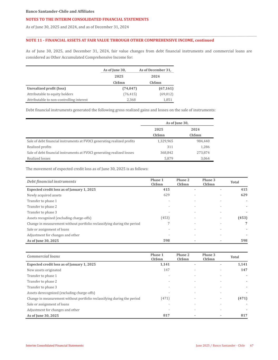 Banco Santander-Chile and Affiliates NOTES TO THE INTERIM CONSOLIDATED FINANCIAL STATEMENTS As of June 30, 2025 and 2024, and as of December 31, 2024 Interim Consolidated Financial Statements June 2025 / Banco Santander - Chile 67 NOTE 11 - FINANCIAL ASSETS AT FAIR VALUE THROUGH OTHER COMPREHENSIVE INCOME, continued As of June 30, 2025, and December 31, 2024, fair value changes from debt financial instruments and commercial loans are considered as Other Accumulated Comprehensive Income for: As of June 30, As of December 31, 2025 2024 Ch$mn Ch$mn Unrealized profit (loss) (74,047) (67,161) Attributable to equity holders (76,415) (69,012) Attributable to non-controlling interest 2,368 1,851 Debt financial instruments generated the following gross realized gains and losses on the sale of instruments: As of June 30, 2025 2024 Ch$mn Ch$mn Sale of debt financial instruments at FVOCI generating realized profits 1,329,965 984,440 Realized profits 311 1,286 Sale of debt financial instruments at FVOCI generating realized losses 368,842 273,874 Realized losses 5,879 3,064 The movement of expected credit loss as of June 30, 2025 is as follows: Debt financial instruments Phase 1 Phase 2 Phase 3 Total Ch$mn Ch$mn Ch$mn Expected credit loss as of January 1, 2025 415 - - 415 Newly acquired assets 629 - - 629 Transfer to phase 1 - - - - Transfer to phase 2 - - - - Transfer to phase 3 - - - - Assets recognized (excluding charge-offs) (453) - - (453) Change in measurement without portfolio reclassifying during the period 7 - - 7 Sale or assignment of loans - - - - Adjustment for changes and other - - - - As of June 30, 2025 598 - - 598 Commercial loans Phase 1 Phase 2 Phase 3 Total Ch$mn Ch$mn Ch$mn Expected credit loss as of January 1, 2025 1,141 - - 1,141 New assets originated 147 - - 147 Transfer to phase 1 - - - - Transfer to phase 2 - - - - Transfer to phase 3 - - - - Assets derecognized (excluding charge-offs) - - - - Change in measurement without portfolio reclassifying during the period (471) - - (471) Sale or assignment of loans - - - - Adjustment for changes and other - - - - As of June 30, 2025 817 - - 817