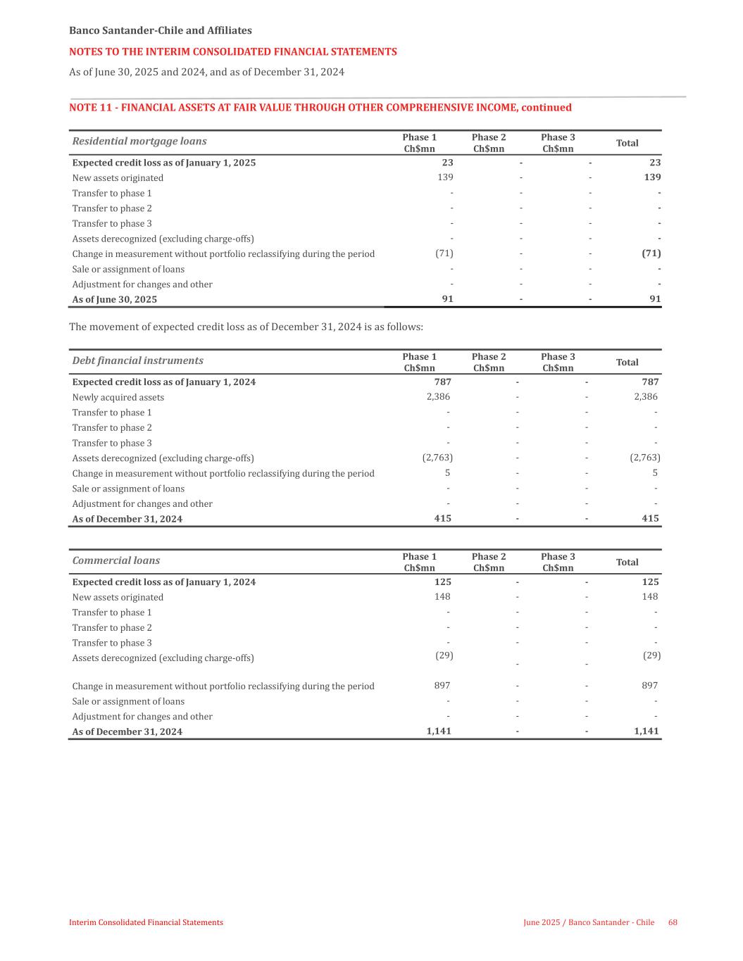 Banco Santander-Chile and Affiliates NOTES TO THE INTERIM CONSOLIDATED FINANCIAL STATEMENTS As of June 30, 2025 and 2024, and as of December 31, 2024 Interim Consolidated Financial Statements June 2025 / Banco Santander - Chile 68 NOTE 11 - FINANCIAL ASSETS AT FAIR VALUE THROUGH OTHER COMPREHENSIVE INCOME, continued Residential mortgage loans Phase 1 Phase 2 Phase 3 Total Ch$mn Ch$mn Ch$mn Expected credit loss as of January 1, 2025 23 - - 23 New assets originated 139 - - 139 Transfer to phase 1 - - - - Transfer to phase 2 - - - - Transfer to phase 3 - - - - Assets derecognized (excluding charge-offs) - - - - Change in measurement without portfolio reclassifying during the period (71) - - (71) Sale or assignment of loans - - - - Adjustment for changes and other - - - - As of June 30, 2025 91 - - 91 The movement of expected credit loss as of December 31, 2024 is as follows: Debt financial instruments Phase 1 Phase 2 Phase 3 Total Ch$mn Ch$mn Ch$mn Expected credit loss as of January 1, 2024 787 - - 787 Newly acquired assets 2,386 - - 2,386 Transfer to phase 1 - - - - Transfer to phase 2 - - - - Transfer to phase 3 - - - - Assets derecognized (excluding charge-offs) (2,763) - - (2,763) Change in measurement without portfolio reclassifying during the period 5 - - 5 Sale or assignment of loans - - - - Adjustment for changes and other - - - - As of December 31, 2024 415 - - 415 Commercial loans Phase 1 Phase 2 Phase 3 Total Ch$mn Ch$mn Ch$mn Expected credit loss as of January 1, 2024 125 - - 125 New assets originated 148 - - 148 Transfer to phase 1 - - - - Transfer to phase 2 - - - - Transfer to phase 3 - - - - Assets derecognized (excluding charge-offs) (29) - - (29) Change in measurement without portfolio reclassifying during the period 897 - - 897 Sale or assignment of loans - - - - Adjustment for changes and other - - - - As of December 31, 2024 1,141 - - 1,141