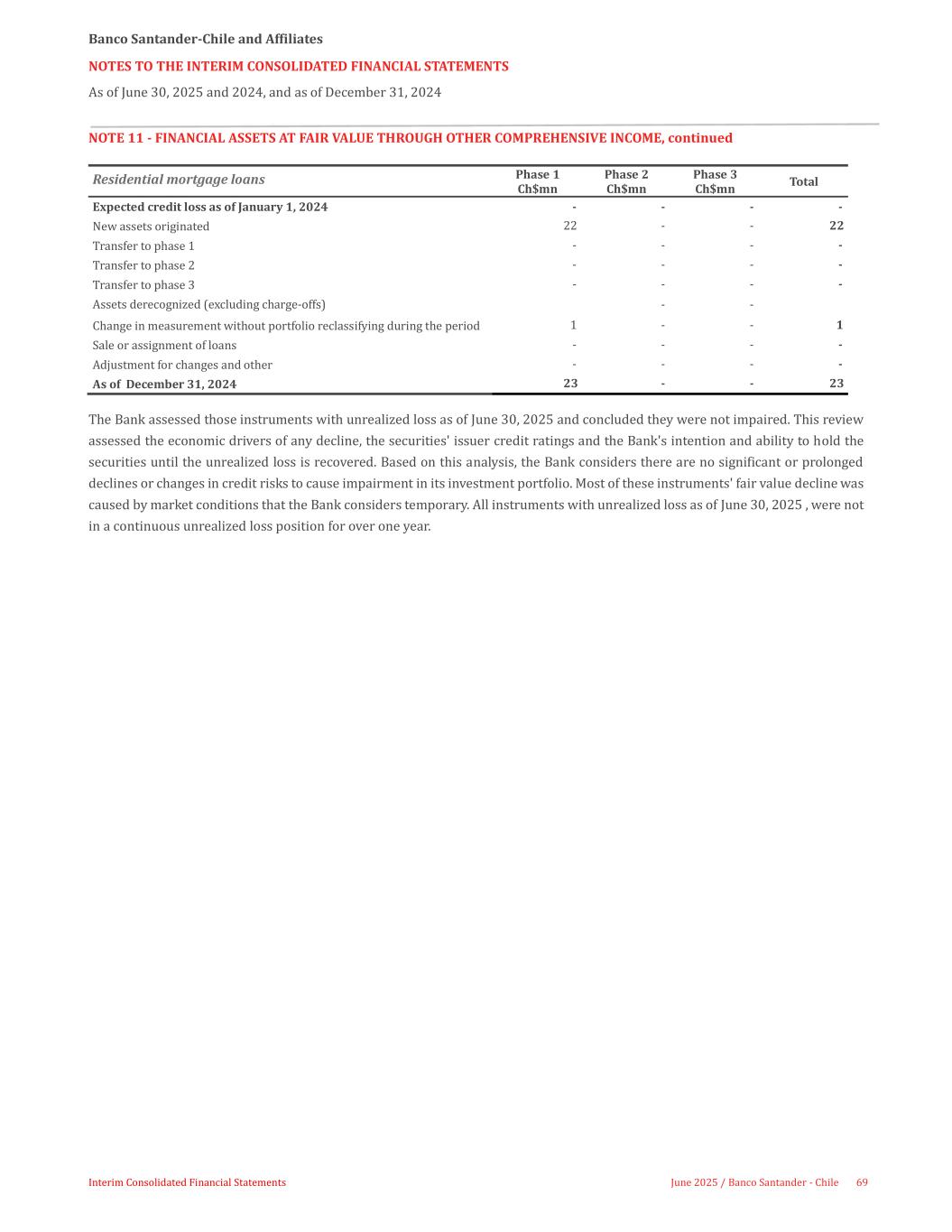 Banco Santander-Chile and Affiliates NOTES TO THE INTERIM CONSOLIDATED FINANCIAL STATEMENTS As of June 30, 2025 and 2024, and as of December 31, 2024 Interim Consolidated Financial Statements June 2025 / Banco Santander - Chile 69 NOTE 11 - FINANCIAL ASSETS AT FAIR VALUE THROUGH OTHER COMPREHENSIVE INCOME, continued Residential mortgage loans Phase 1 Phase 2 Phase 3 Total Ch$mn Ch$mn Ch$mn Expected credit loss as of January 1, 2024 - - - - New assets originated 22 - - 22 Transfer to phase 1 - - - - Transfer to phase 2 - - - - Transfer to phase 3 - - - - Assets derecognized (excluding charge-offs) - - Change in measurement without portfolio reclassifying during the period 1 - - 1 Sale or assignment of loans - - - - Adjustment for changes and other - - - - As of December 31, 2024 23 - - 23 The Bank assessed those instruments with unrealized loss as of June 30, 2025 and concluded they were not impaired. This review assessed the economic drivers of any decline, the securities' issuer credit ratings and the Bank's intention and ability to hold the securities until the unrealized loss is recovered. Based on this analysis, the Bank considers there are no significant or prolonged declines or changes in credit risks to cause impairment in its investment portfolio. Most of these instruments' fair value decline was caused by market conditions that the Bank considers temporary. All instruments with unrealized loss as of June 30, 2025 , were not in a continuous unrealized loss position for over one year.