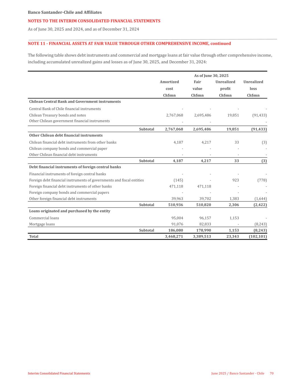Banco Santander-Chile and Affiliates NOTES TO THE INTERIM CONSOLIDATED FINANCIAL STATEMENTS As of June 30, 2025 and 2024, and as of December 31, 2024 Interim Consolidated Financial Statements June 2025 / Banco Santander - Chile 70 NOTE 11 - FINANCIAL ASSETS AT FAIR VALUE THROUGH OTHER COMPREHENSIVE INCOME, continued The following table shows debt instruments and commercial and mortgage loans at fair value through other comprehensive income, including accumulated unrealized gains and losses as of June 30, 2025, and December 31, 2024: As of June 30, 2025 Amortized Fair Unrealized Unrealized cost value profit loss Ch$mn Ch$mn Ch$mn Ch$mn Chilean Central Bank and Government instruments Central Bank of Chile financial instruments - - - - Chilean Treasury bonds and notes 2,767,068 2,695,486 19,851 (91,433) Other Chilean government financial instruments - - - Subtotal 2,767,068 2,695,486 19,851 (91,433) Other Chilean debt financial instruments Chilean financial debt instruments from other banks 4,187 4,217 33 (3) Chilean company bonds and commercial paper - - - - Other Chilean financial debt instruments - - - - Subtotal 4,187 4,217 33 (3) Debt financial instruments of foreign central banks Financial instruments of foreign central banks - - - - Foreign debt financial instruments of governments and fiscal entities (145) - 923 (778) Foreign financial debt instruments of other banks 471,118 471,118 - - Foreign company bonds and commercial papers - - - - Other foreign financial debt instruments 39,963 39,702 1,383 (1,644) Subtotal 510,936 510,820 2,306 (2,422) Loans originated and purchased by the entity Commercial loans 95,004 96,157 1,153 - Mortgage loans 91,076 82,833 - (8,243) Subtotal 186,080 178,990 1,153 (8,243) Total 3,468,271 3,389,513 23,343 (102,101)
