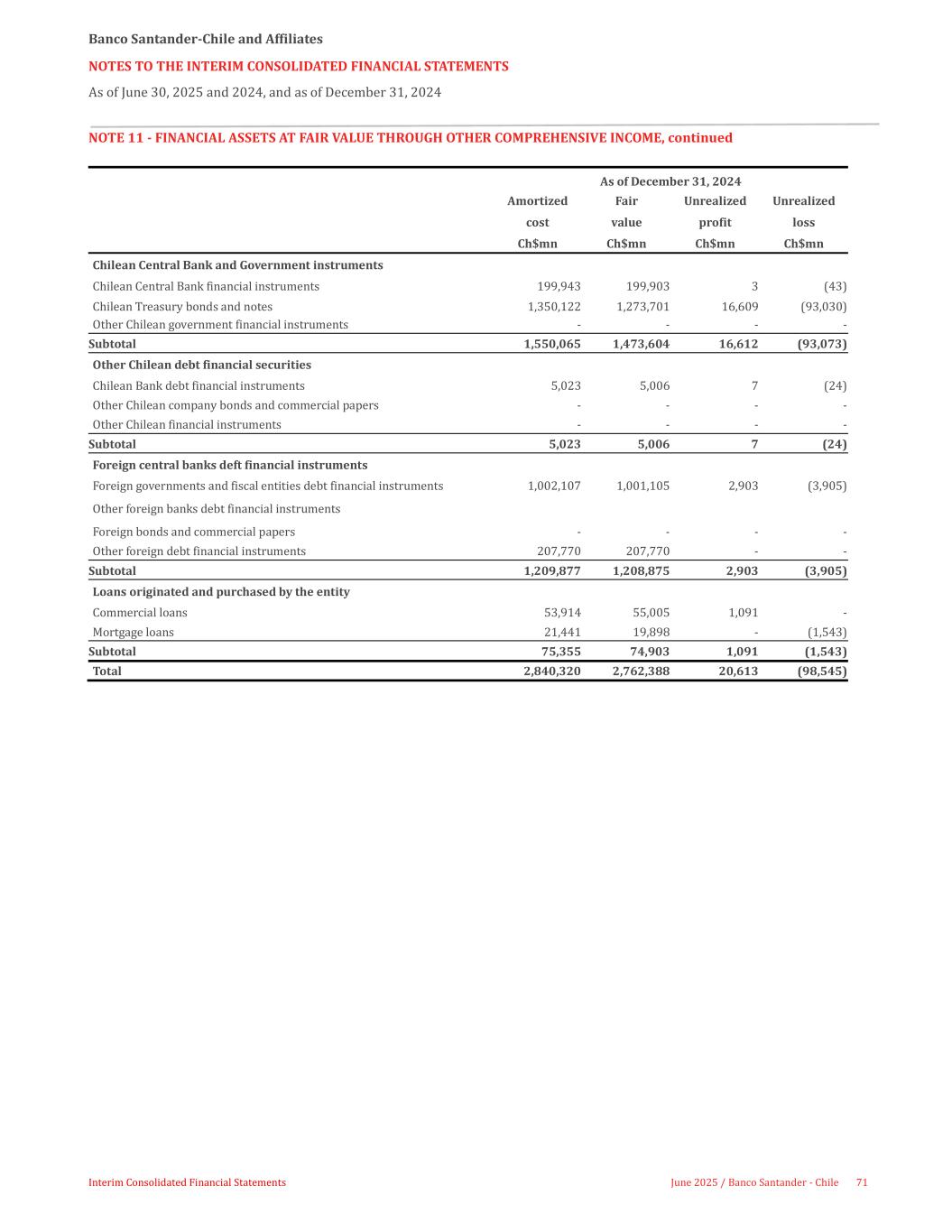 Banco Santander-Chile and Affiliates NOTES TO THE INTERIM CONSOLIDATED FINANCIAL STATEMENTS As of June 30, 2025 and 2024, and as of December 31, 2024 Interim Consolidated Financial Statements June 2025 / Banco Santander - Chile 71 NOTE 11 - FINANCIAL ASSETS AT FAIR VALUE THROUGH OTHER COMPREHENSIVE INCOME, continued As of December 31, 2024 Amortized Fair Unrealized Unrealized cost value profit loss Ch$mn Ch$mn Ch$mn Ch$mn Chilean Central Bank and Government instruments Chilean Central Bank financial instruments 199,943 199,903 3 (43) Chilean Treasury bonds and notes 1,350,122 1,273,701 16,609 (93,030) Other Chilean government financial instruments - - - - Subtotal 1,550,065 1,473,604 16,612 (93,073) Other Chilean debt financial securities Chilean Bank debt financial instruments 5,023 5,006 7 (24) Other Chilean company bonds and commercial papers - - - - Other Chilean financial instruments - - - - Subtotal 5,023 5,006 7 (24) Foreign central banks deft financial instruments Foreign governments and fiscal entities debt financial instruments 1,002,107 1,001,105 2,903 (3,905) Other foreign banks debt financial instruments Foreign bonds and commercial papers - - - - Other foreign debt financial instruments 207,770 207,770 - - Subtotal 1,209,877 1,208,875 2,903 (3,905) Loans originated and purchased by the entity Commercial loans 53,914 55,005 1,091 - Mortgage loans 21,441 19,898 - (1,543) Subtotal 75,355 74,903 1,091 (1,543) Total 2,840,320 2,762,388 20,613 (98,545)